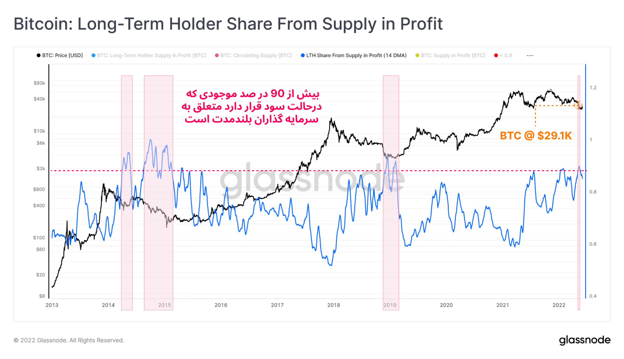 اکنون برای اینکه از زاویهی دیگری این مشاهدات را بررسی کنیم، سهم بیتکوین های سودآوری را که توسط سرمایهگذاران بلندمدتی نگهداری شده اند، ارزیابی می کنیم و یا به عبارتی خواهیم دید که سرمایهگذاران بلندمدت از سودآوری بازار چه مقدار سهم دارند. در نمودار زیر، افزایش سهم سرمایهگذاران بلندمدت ( و یا کاهش سهم سرمایهگذاران کوتاهمدت) را در اواخر بازار خرسی، به وضوح می توانیم ببینیم.