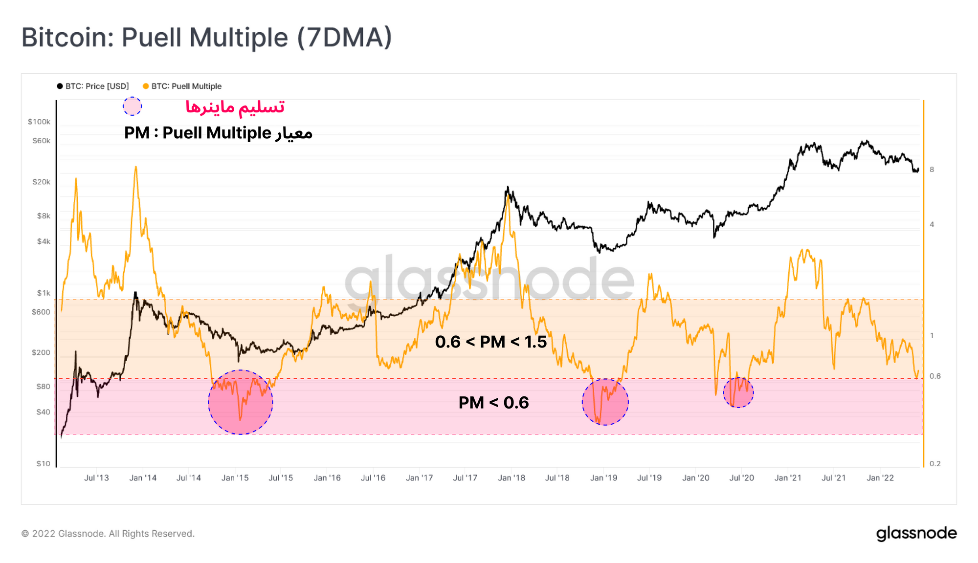 با بررسی تاریخچه کلی معیار Puell Multipleبازار خرسی دومرحلهای که در بخش قبلی به آن اشاره شد، در این معیار نیز مشاهده می شود.در اوایل بازار خرسی، مقدار این معیار بین ۰.۶ تا ۱.۰ قرار می گیرد که به عبارتی نشان می دهد درآمد فعلی ماینرها به طور میانگین ۴۰ درصد کمتر از سال گذشته است. سپس در مرحله دوم بازار خرسی معمولا زمانی که تسلیم نهایی بازار رخ می دهد ، مقدار این معیار به زیر ۰.۵ می رسد.