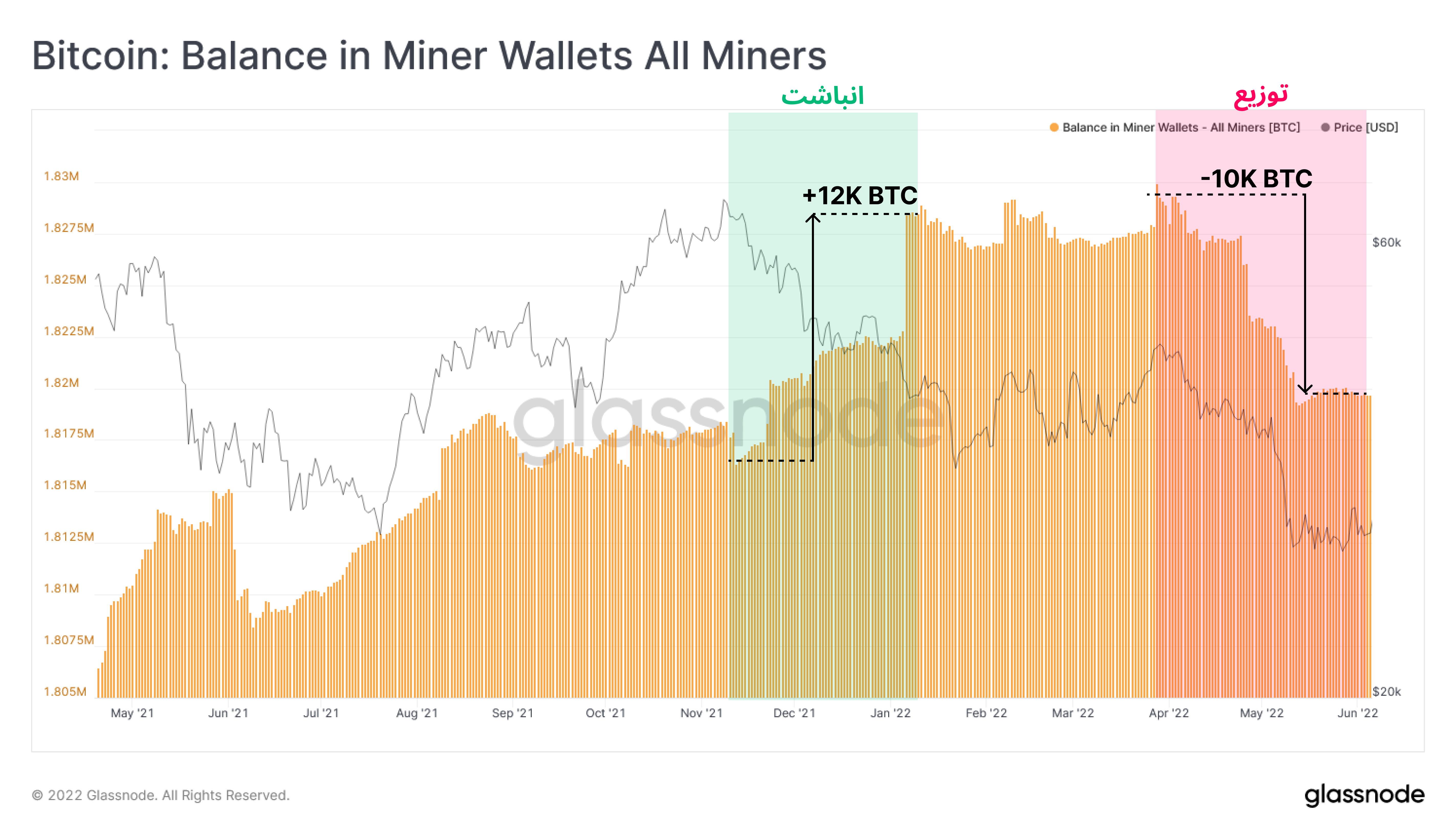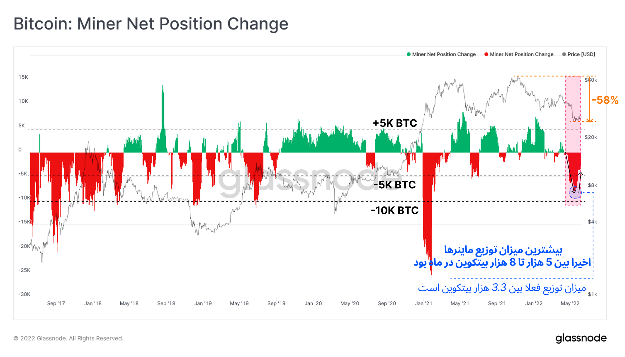بعد از سقوط قیمتی ATH نوامبر، ماینرها حدود ۱۲ هزار بیتکوین جمعآوری کردند اما با سقوط دوباره قیمت دراثر فروش ۸۰ هزار بیتکوین توسط LUNA برای حفاظت از UST، ماینرها حدود ۱۰ هزار بیتکوین فروختند که این مورد فشار فروش بازار را افزایش داد. با این اوصاف رفتار ماینرها نسبت به سقوط قیمتی قبلی تغییر پیدا کرده است.