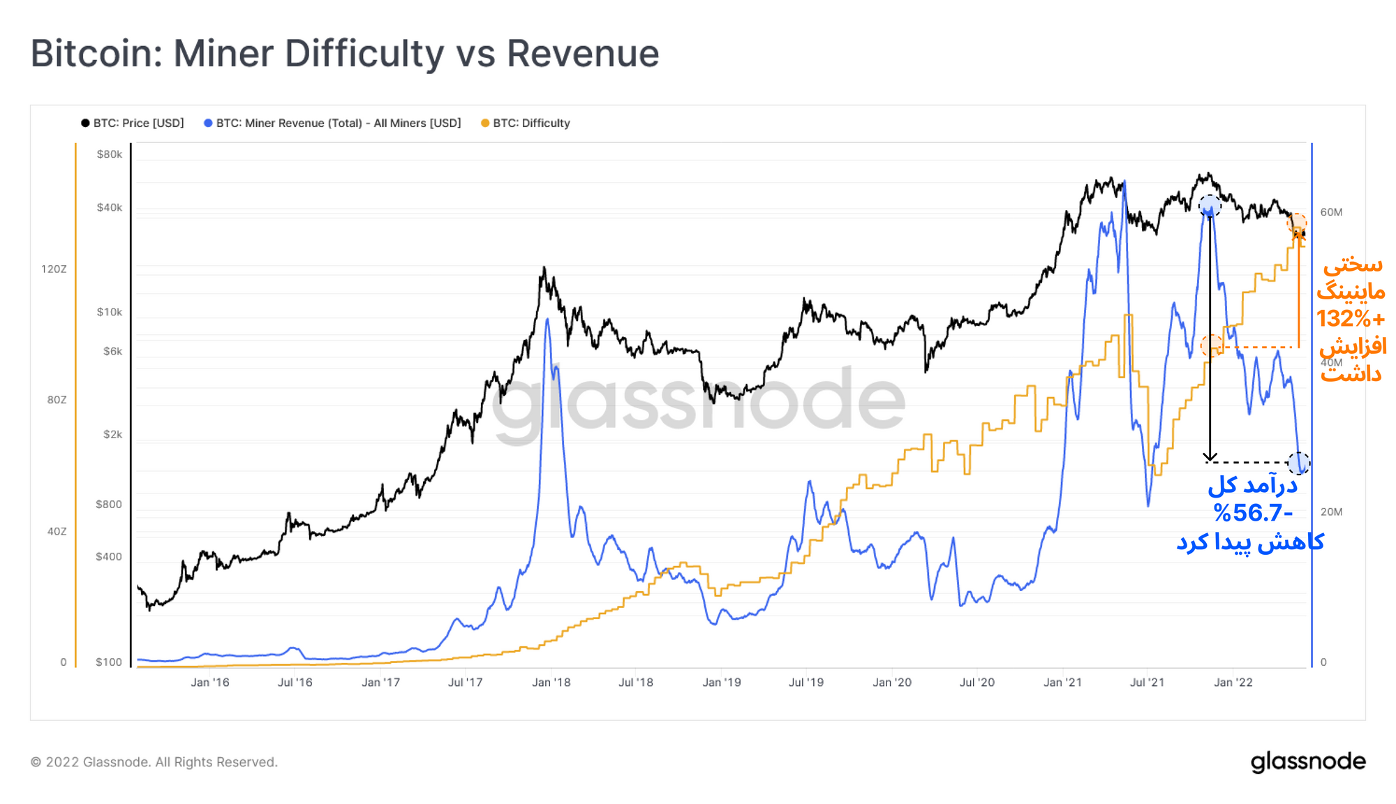روند سختی شبکه از ATH قبلی ، ۱۳۲ درصد رشد داشته و از طرفی دیگر درآمد ماینرها ۵۶.۷ درصد افت پیدا کرده است. به همین جهت واگرایی چشمگیری بین این دو مشاهده می شود. افزایش سختی شبکه به این معناست که ماینرهای قبلی، فعالیت ماینینگ خود را گسترش دادهاند و ماینرهای جدید ، با وجود کاهش درآمد فعالیت ماینینگ خود را آغاز کردند. به همین جهت این احتمال وجود دارد که اگر برای سختافزارها و تجهیزات ماینینگ هزینه ی بیشتری صرف شود، درآمد ماینرها باز هم به کاهش خود ادامه میدهد.