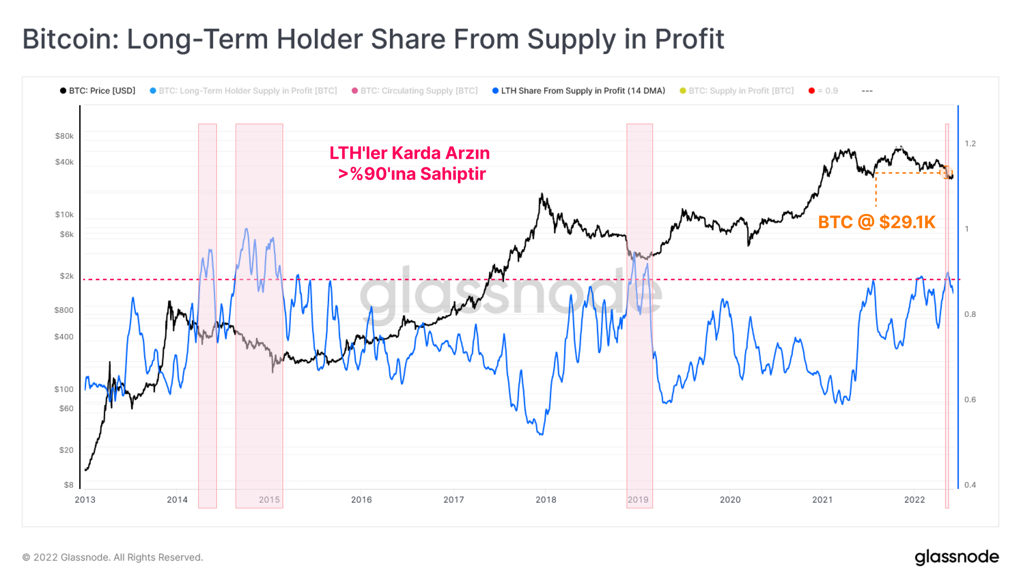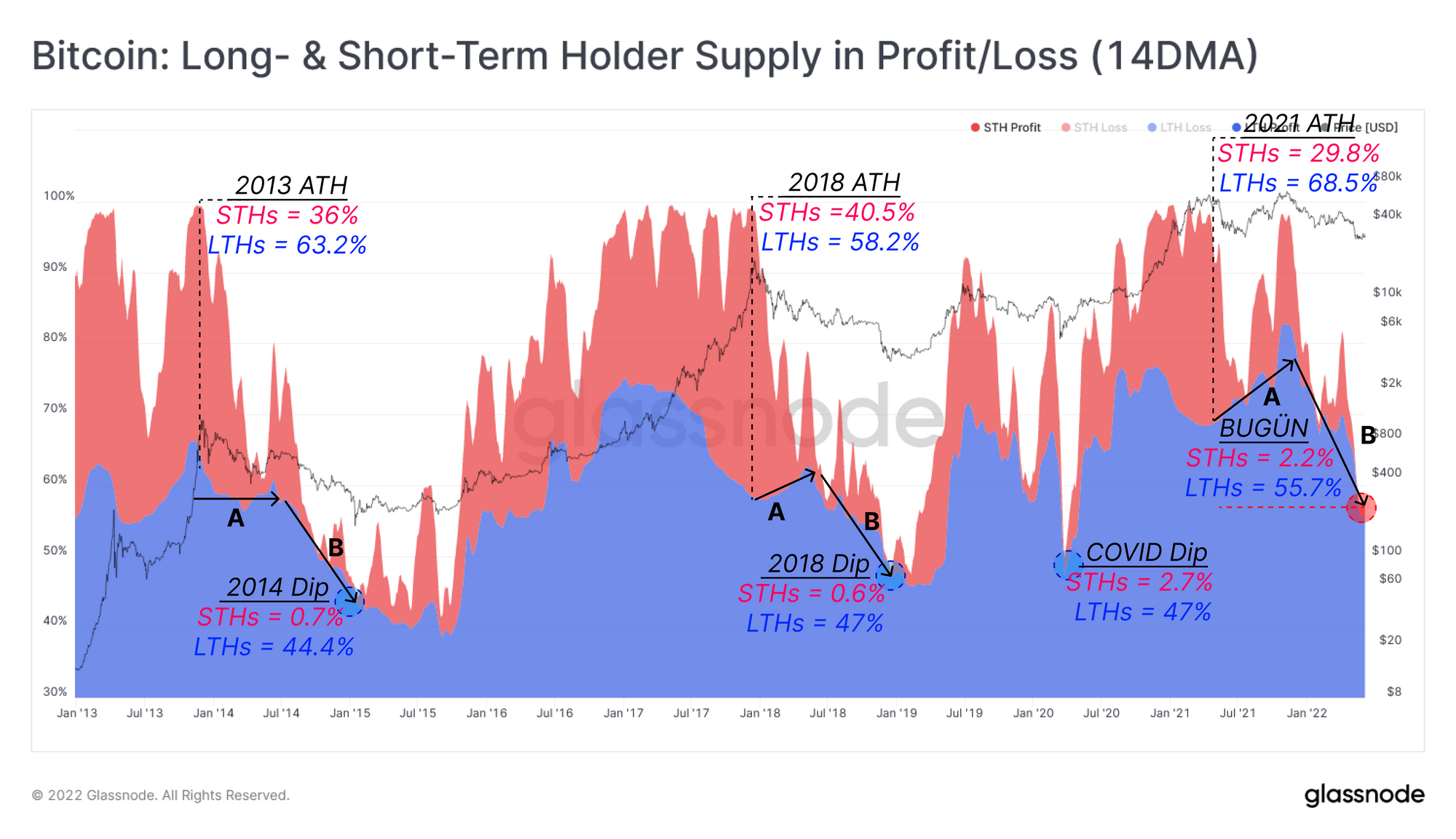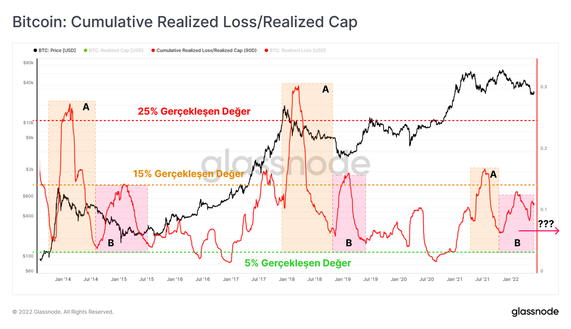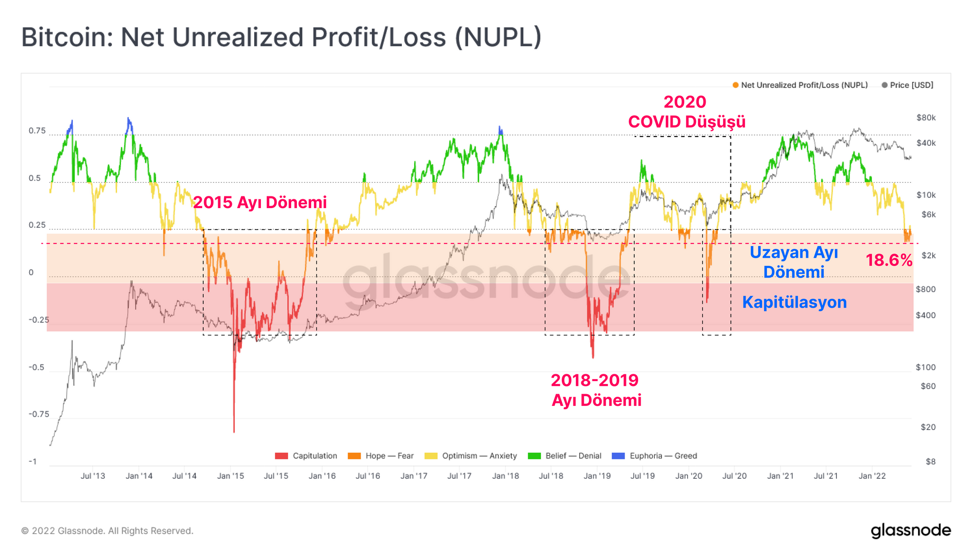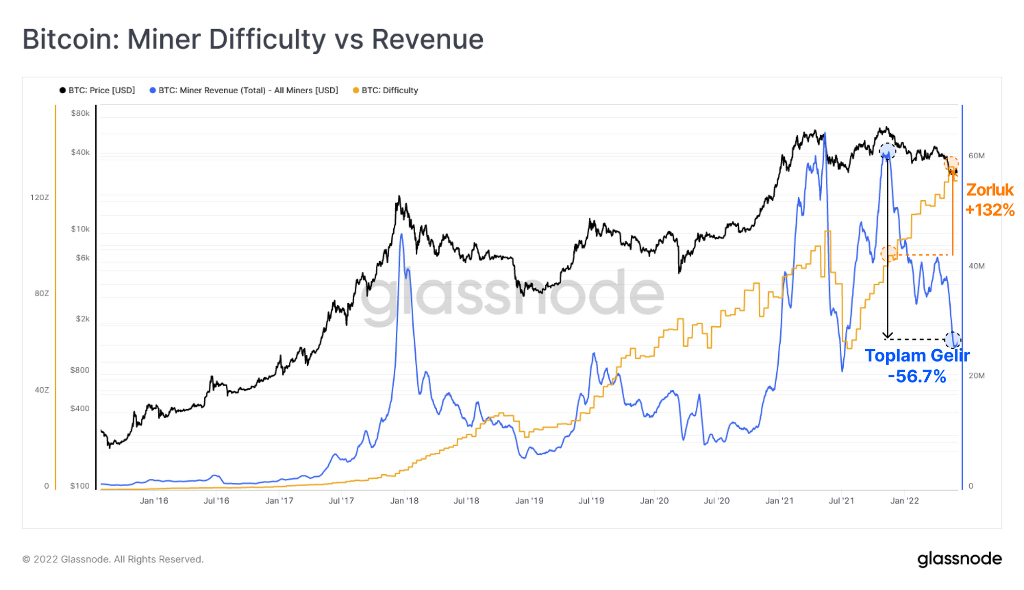 2021-22 döneminin en düşük fiyatlarında seyreden piyasa ile birlikte, yatırımcıların büyük çoğunluğu şu anda gerçekleşmemiş kayıplara sahip. Ayrıca, madenciler üretim maliyetleri yükselirken gelirlerin düşmesiyle bir miktar gelir stresi yaşıyor gibi görünüyor.