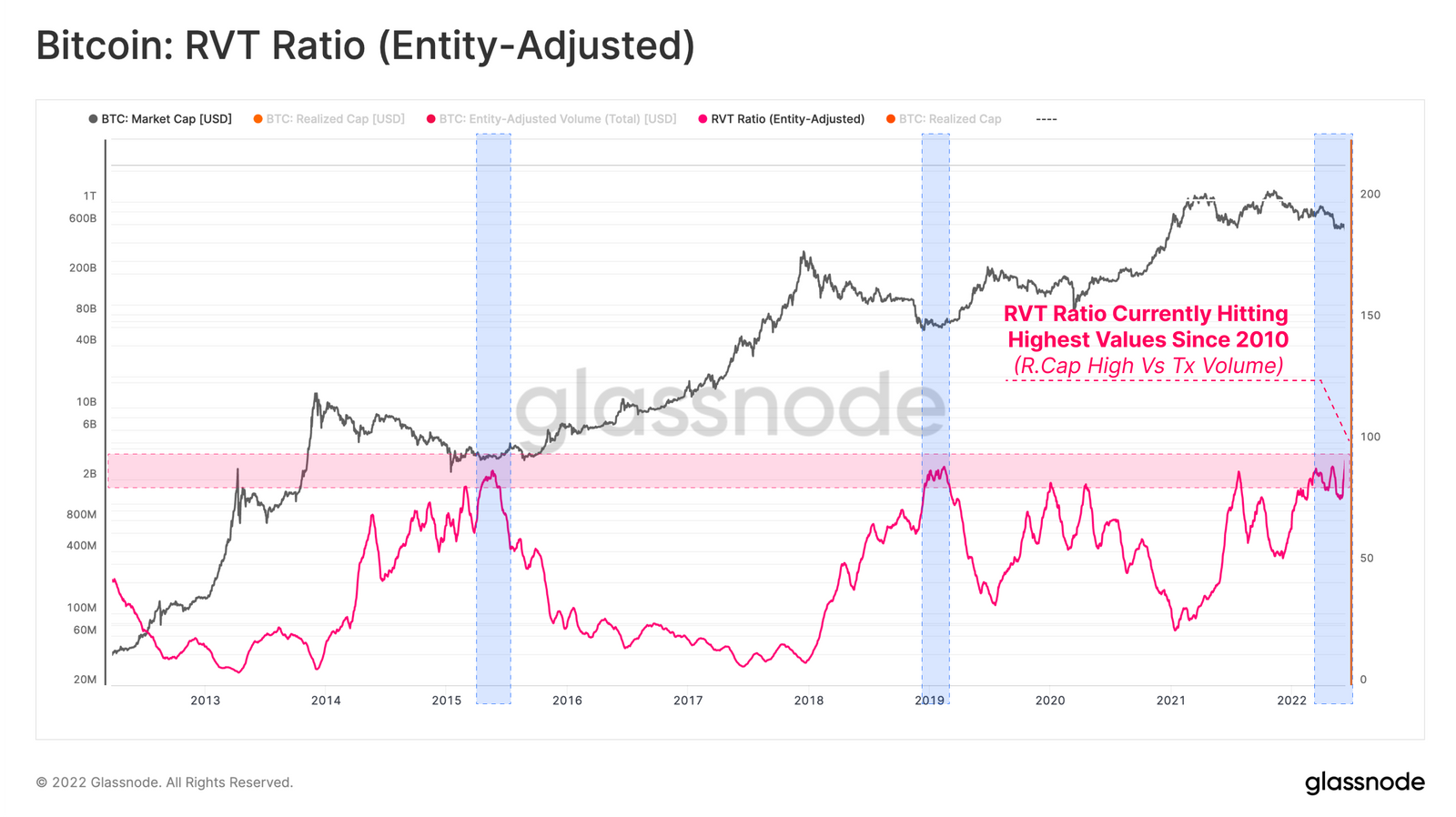 محدوده قرمز، مقدار RVT هشتاد و یا بالاتر را نشان میدهد که به عبارتی ارزش شبکه (Realized cap) در این منطقه هشتاد برابر حجم تراکنشهای شبکه است. این حالت به این معناست شبکه آنچین فعالیت ناچیزی دارد که براثر ضعف قیمت ایجاد شده و تمام افرادی را که نسبت به کاهش قیمت واکنش نشان دادند، از بازار خارج کرده است.