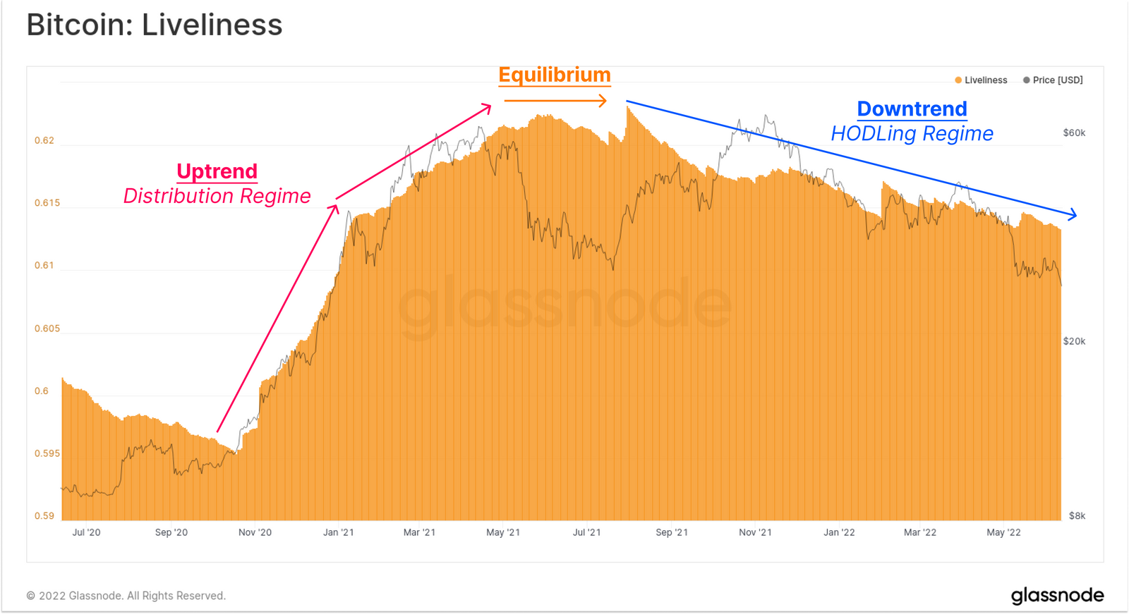 این معیار از ماه اوت سال ۲۰۲۱ در روند نزولی قرار داشته است. با توجه به اینکه در حال حاضر هولدرها تنها عضو فعال بازار هستند، بیتکوین فعلا در مرحلهای قرار دارد که روز- کوین ها بیشتر تولید و کمتر خرج میشوند.