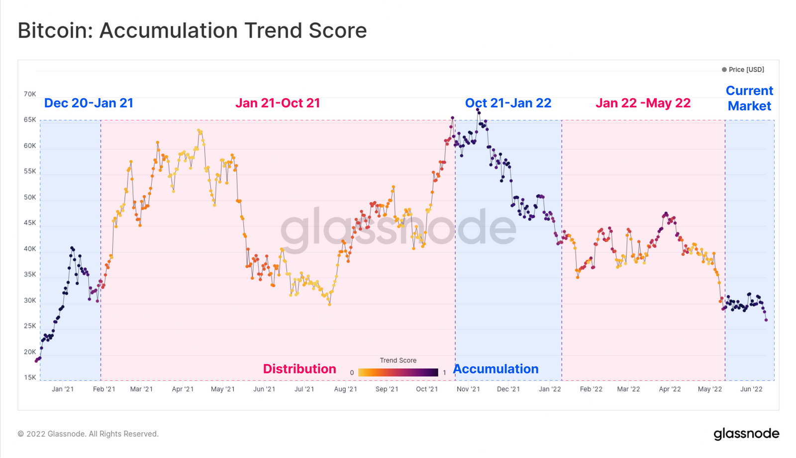 Στην τρέχουσα αγορά, είδαμε έναν μήνα με Βαθμολογία Τάσης Συσσώρευσης πάνω του 0,8, που σηματοδοτεί υψηλές θετικές μεταβολές του ισοζυγίου σε ολόκληρη την αγορά. Πρόκειται για μια αξιοσημείωτη μετατόπιση σε σχέση με τη διαλείπουσα συσσώρευση πριν από το ξεπούλημα του LUNA και μπορεί να υποδηλώνει μια βελτιωμένη αντίληψη των επενδυτών για την αξία σε τιμές των $30k και κάτω από αυτά.