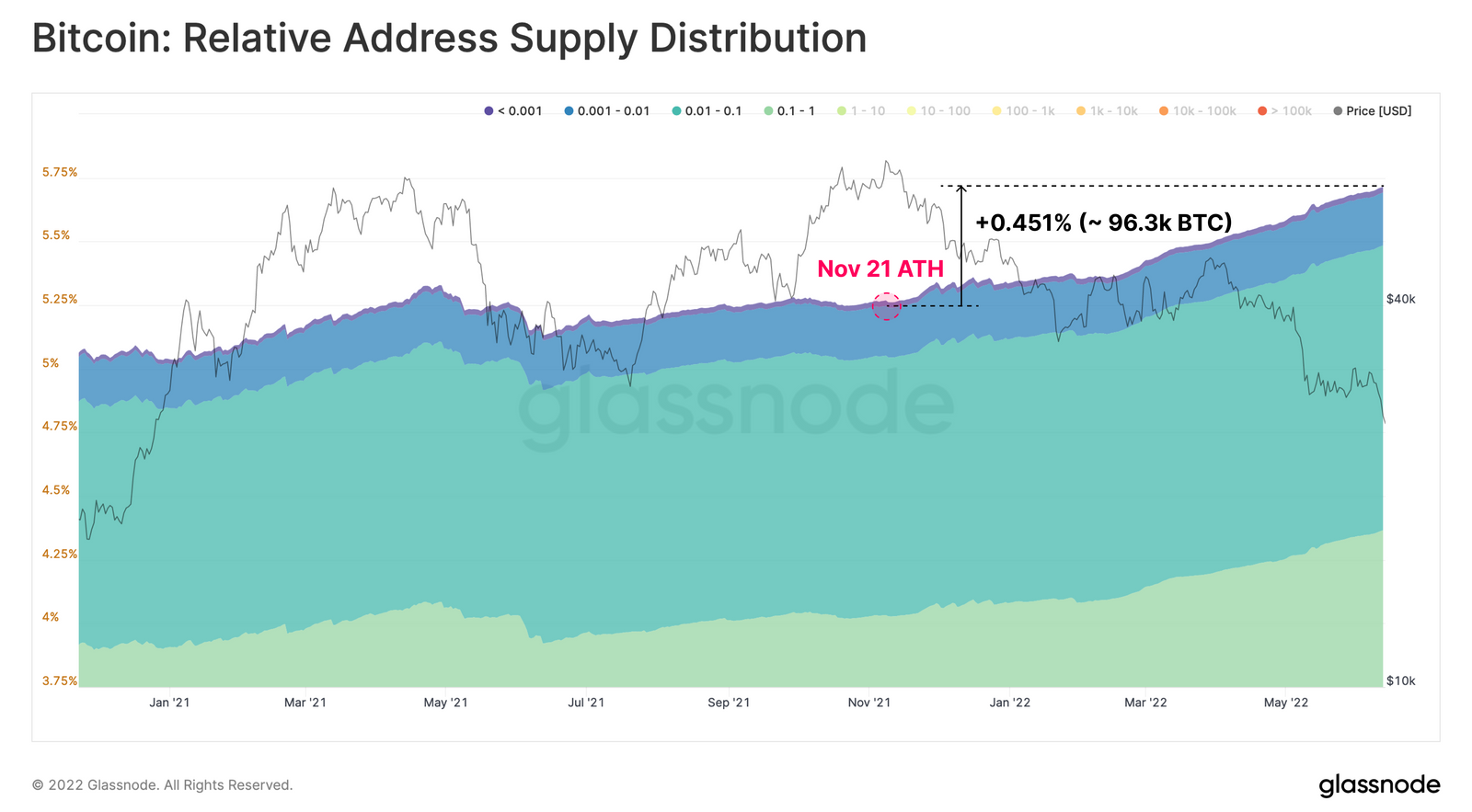 Αν και ο τρέχων ρυθμός αύξησης του υπολοίπου φθίνει, προηγήθηκε η πιο επιθετική και συνεπής περίοδος συσσώρευσης μετά την αρχική άνοδο του Bitcoin τους τελευταίους 18 μήνες. Αυτοί οι μικροϊδιοκτήτες είδαν μια καθαρή αύξηση υπολοίπου κατά +20.863 Bitcoin από την κατάρρευση του Luna στις 9 Μαΐου, παρέχοντας συμβολή με την Βαθμολογία Τάσης Συσσώρευσης του Cohort.