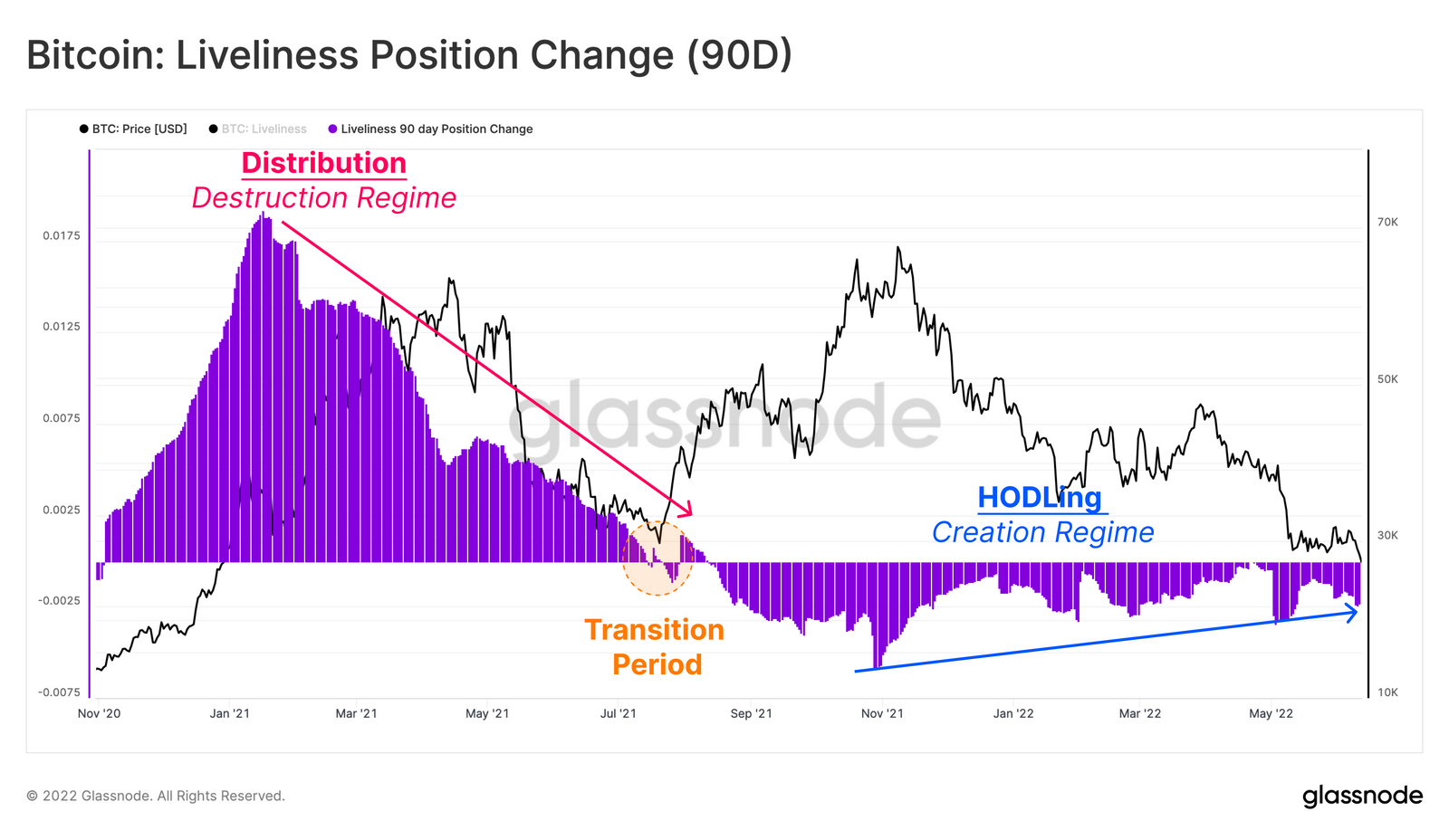 Μπορούμε επίσης να κοιτάξουμε προς τη μετρική Liveliness για να κατανοήσουμε την προτίμηση της αγοράς για HODLing ή διανεμητική συμπεριφορά. Η Liveliness καθορίζει την ισορροπία μεταξύ της συνολικής Ημέρας Καταστροφής Νομίσματος (Coin Day Destruction) και της Μέρας Δημιουργίας Νομίσματος (Coin Day Creation). Επομένως, μπορεί να χρησιμοποιηθεί για την παροχή συμβολής με τα καθεστώτα καταστροφής και συσσώρευσης.