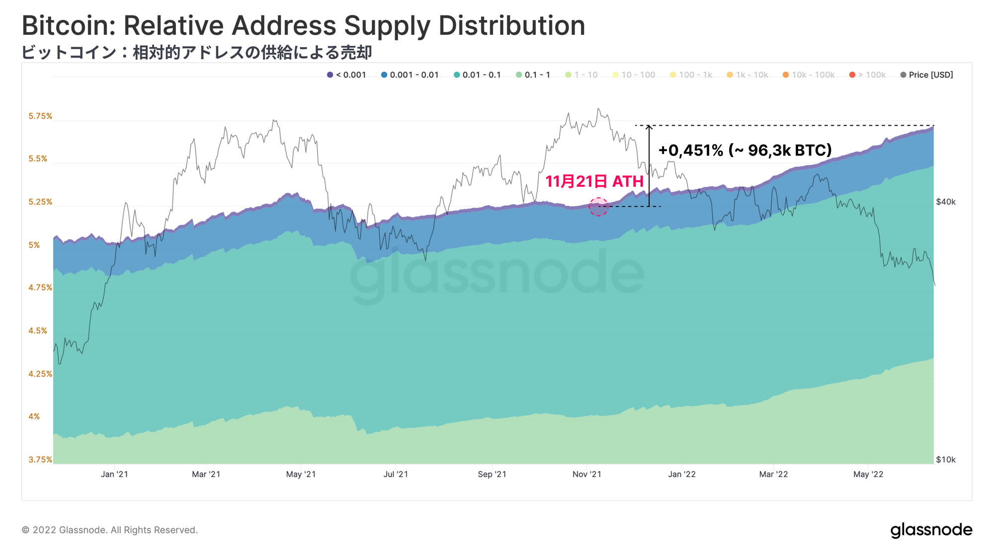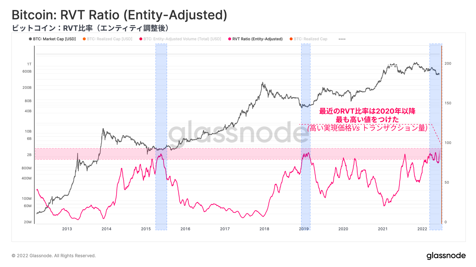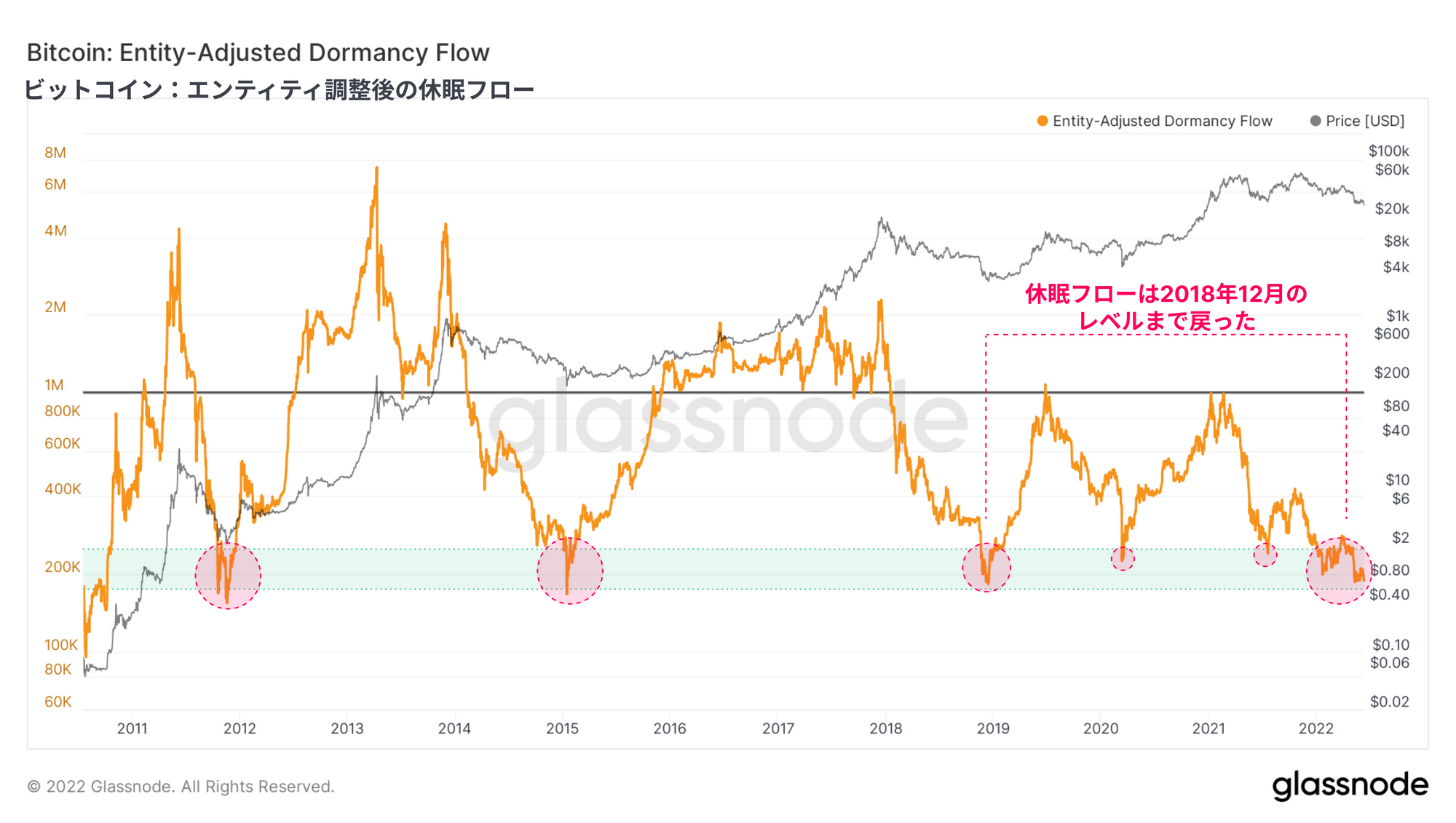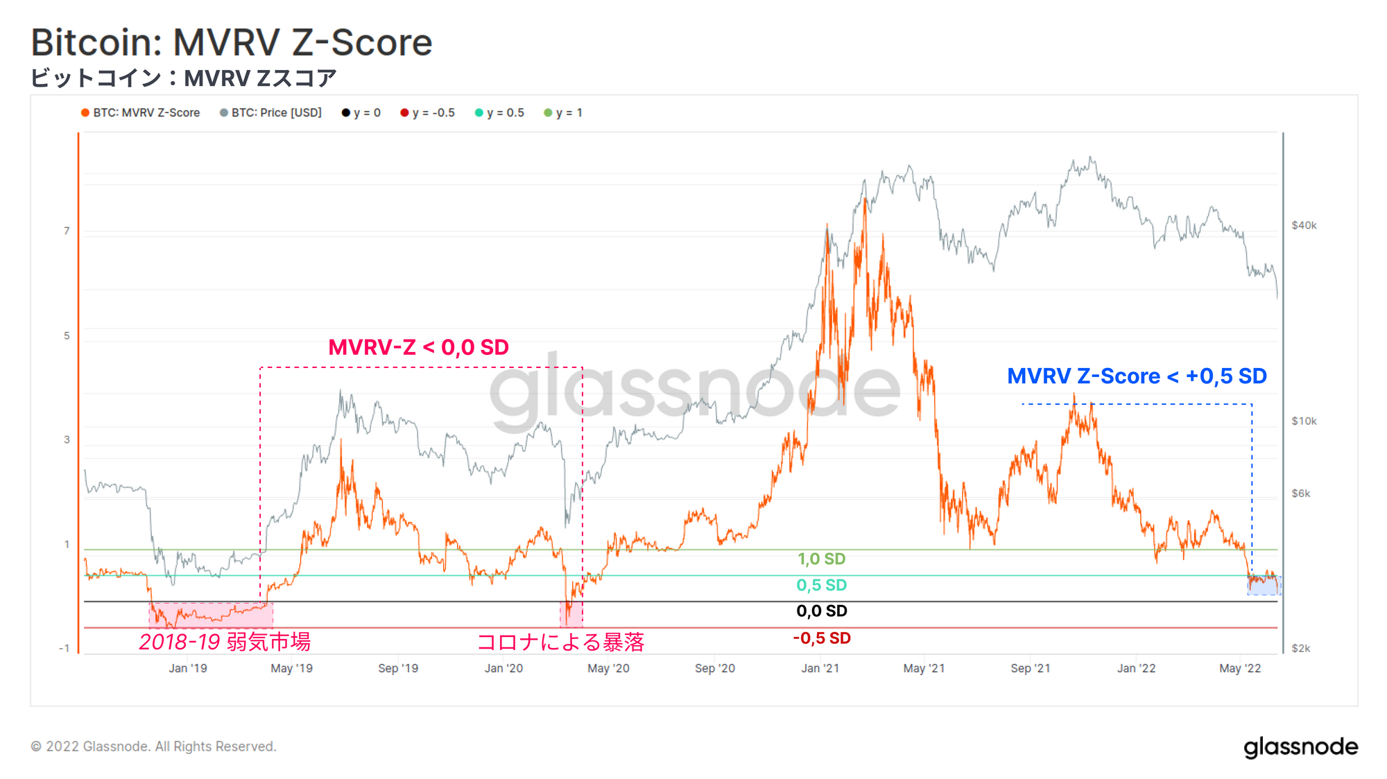 ビットコインのネットワーク利用率は低迷を続け、RVTなどのマクロ指標は未知の弱気領域に突入している。エビ(< 1BTC)、クジラ(> 10k BTC)を問わず蓄積は続いているが、価格のサポートラインが確立されるには程遠い。多くのマクロ評価指標が売られすぎの状態を示し続けているにもかかわらず、ビットコインは依然として伝統的市場と相関性があり、価格は反応し打撃を受けている。