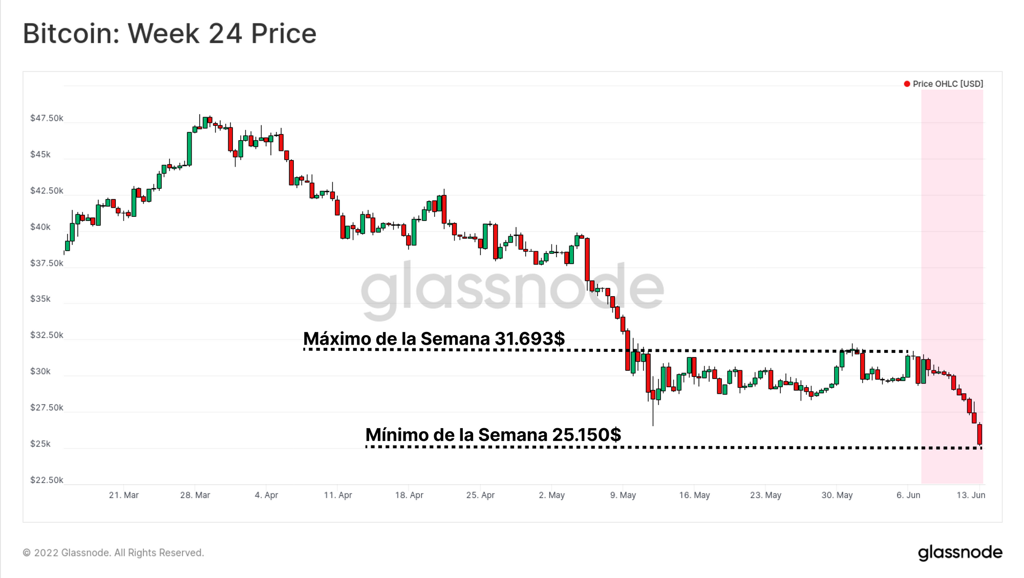 Tanto Bitcoin como el resto de activos digitales han experimentado una nueva semana caótica con acción de precio bajista, cediendo desde la apertura semanal en los 31.693$ hasta un nuevo mínimo multi-anual de 25.150$. Las tribulaciones macroeconómicas siguen ejerciendo influencia a gran escala, especialmente el IPC estadounidense que supera todas las expectativas con un 8,6% y una nueva inversión de la rentabilidad de los Bonos del Estado americanos de 2 a 10 años durante las primeras horas del lunes. Se ha juntado todo con la nueva gran carrera alcista del Índice Dólar (DXY), a la par que Bitcoin cierra su 10ª vela roja en 11 semanas.