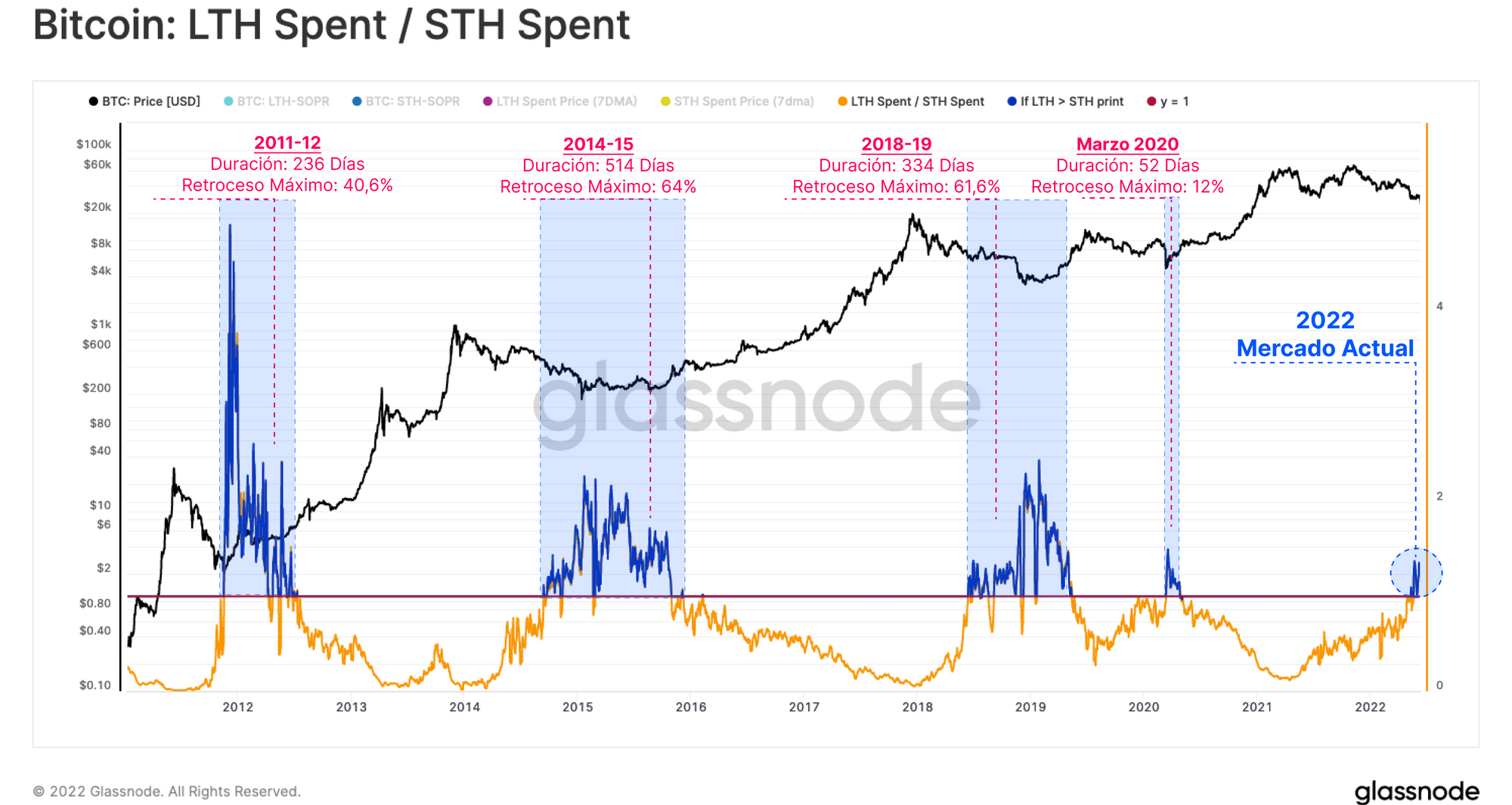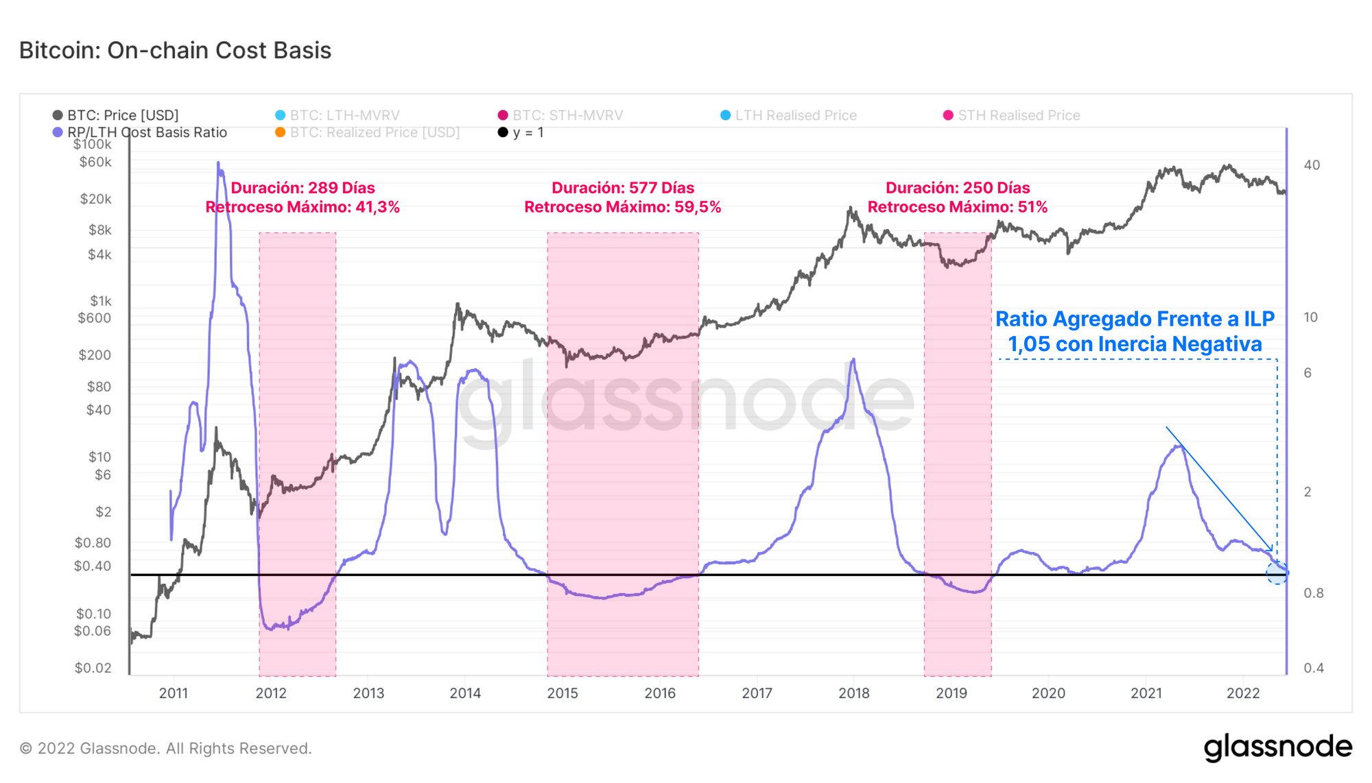 En esta entrega, vamos a analizar cómo el mercado bajista actual se adentra en la fase que mejor se alinea con lo más profundo y oscuro de los anteriores mercados bajistas. De media el mercado a penas es capaz de mantenerse a flote sobre su coste base, e incluso la base inversora se está purgando de los Inversores a Largo Plazo.