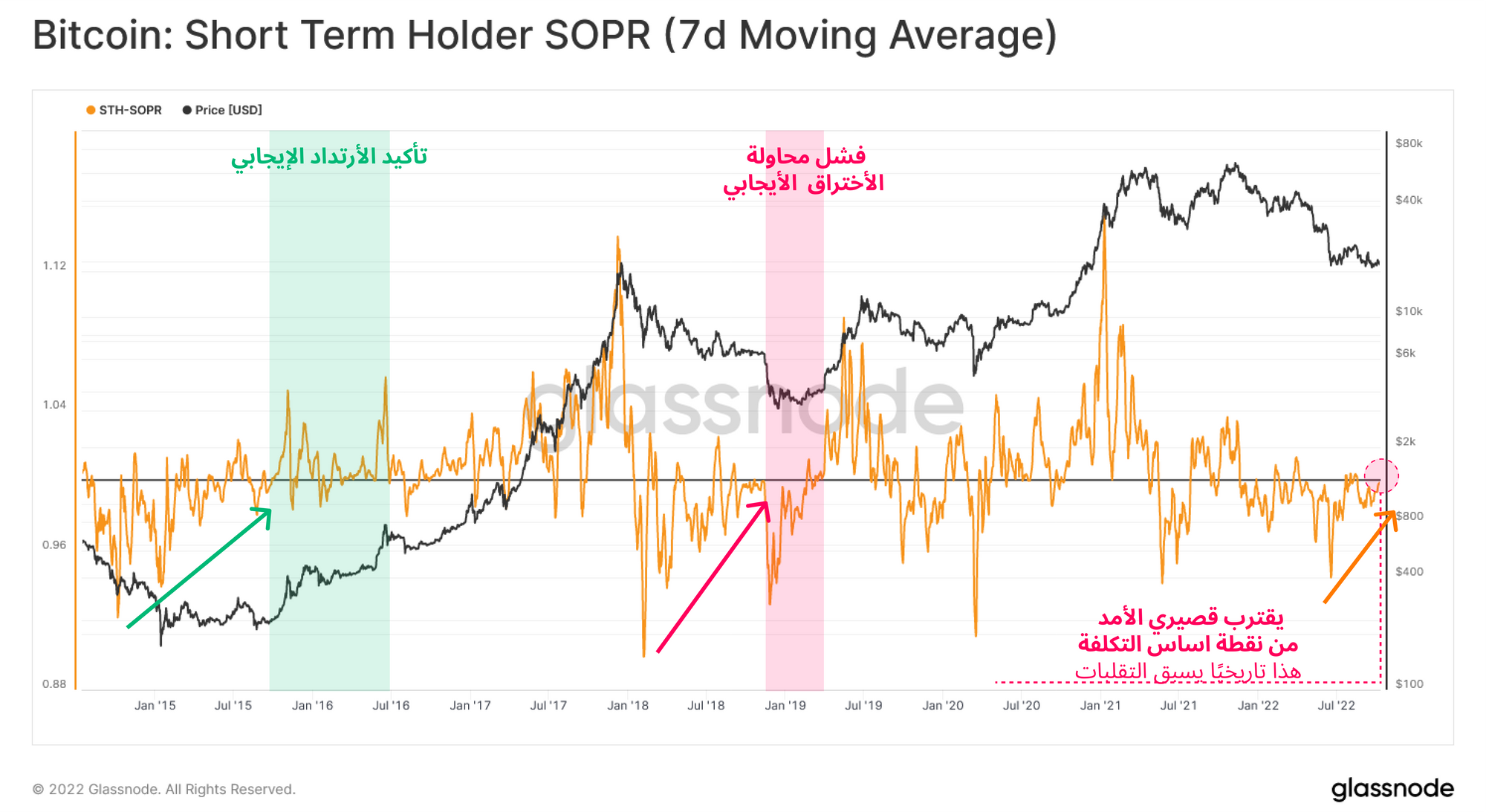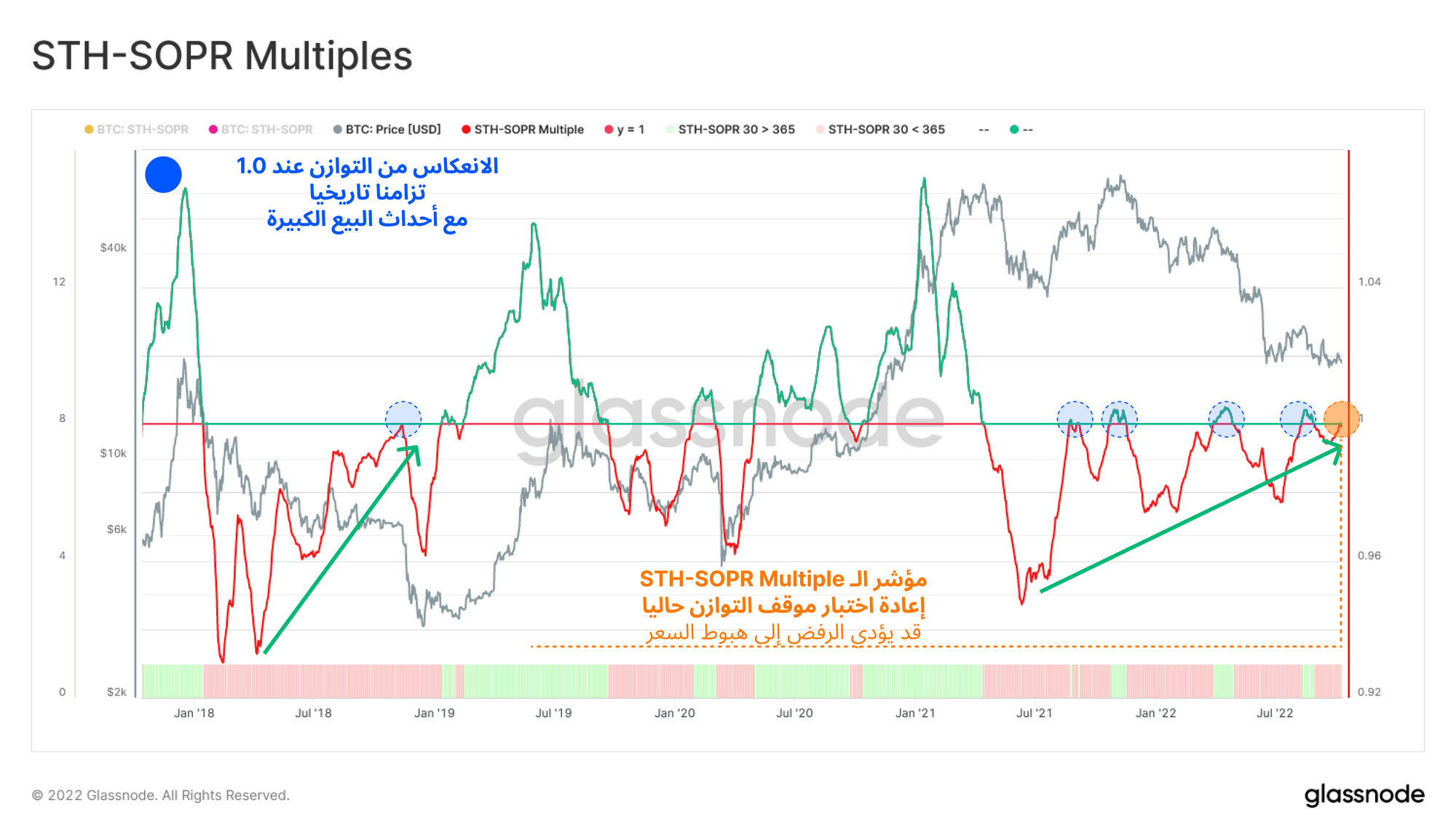 🔔 فكرة تنبيه: كسر STH-aSOPR (على المتوسط المتحرك البسيط للسبعة ايام) فوق 1.0 يمكن أن يشير إلى تحسن في ربحية السوق ، وهو إشارة مبكرة لتعافي السوق المحتمل.