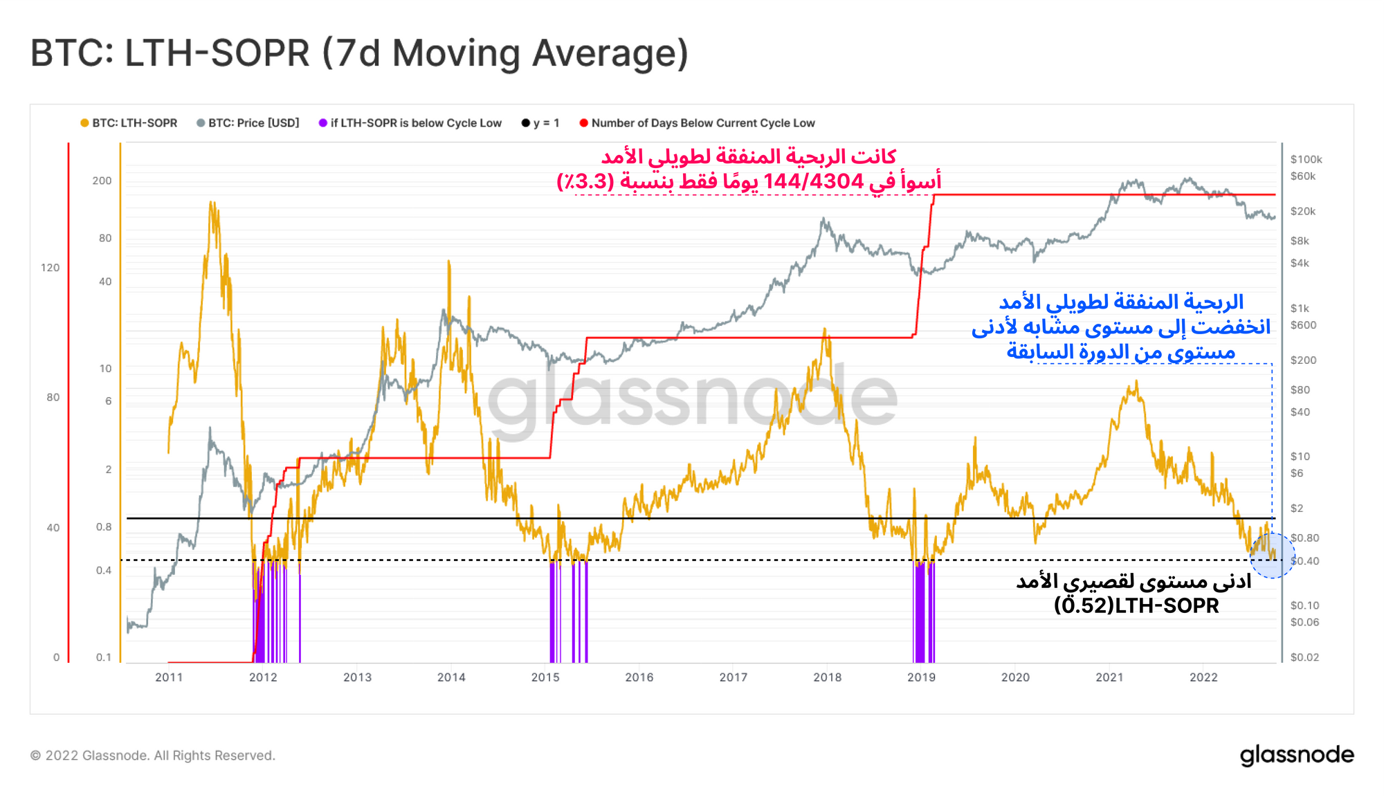 تحدث هذه الفترات من الضغوط الربحية الشديدة للمالكين الطويلي الامد LTH عمومًا عند الوصول الى أعماق البير ماركت مع 3.3 ٪ 🟣 فقط من أيام التداول التي تتكبد خسائر أعلى.