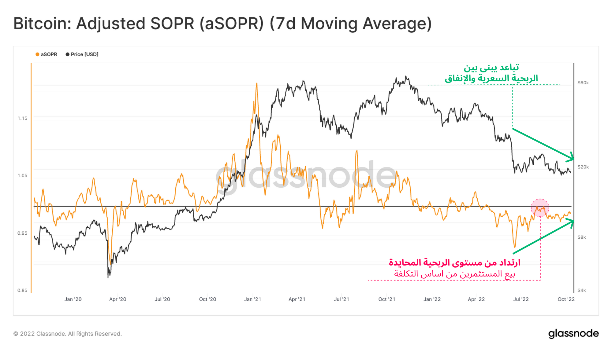 🔔 فكرة تنبيه: كسر aSOPR (على المتوسط المتحرك البسيط للسبعة ايام) فوق 1.0 يمكن أن يشير إلى تحسن في ربحية السوق ، وهو إشارة مبكرة لتعافي السوق المحتمل.