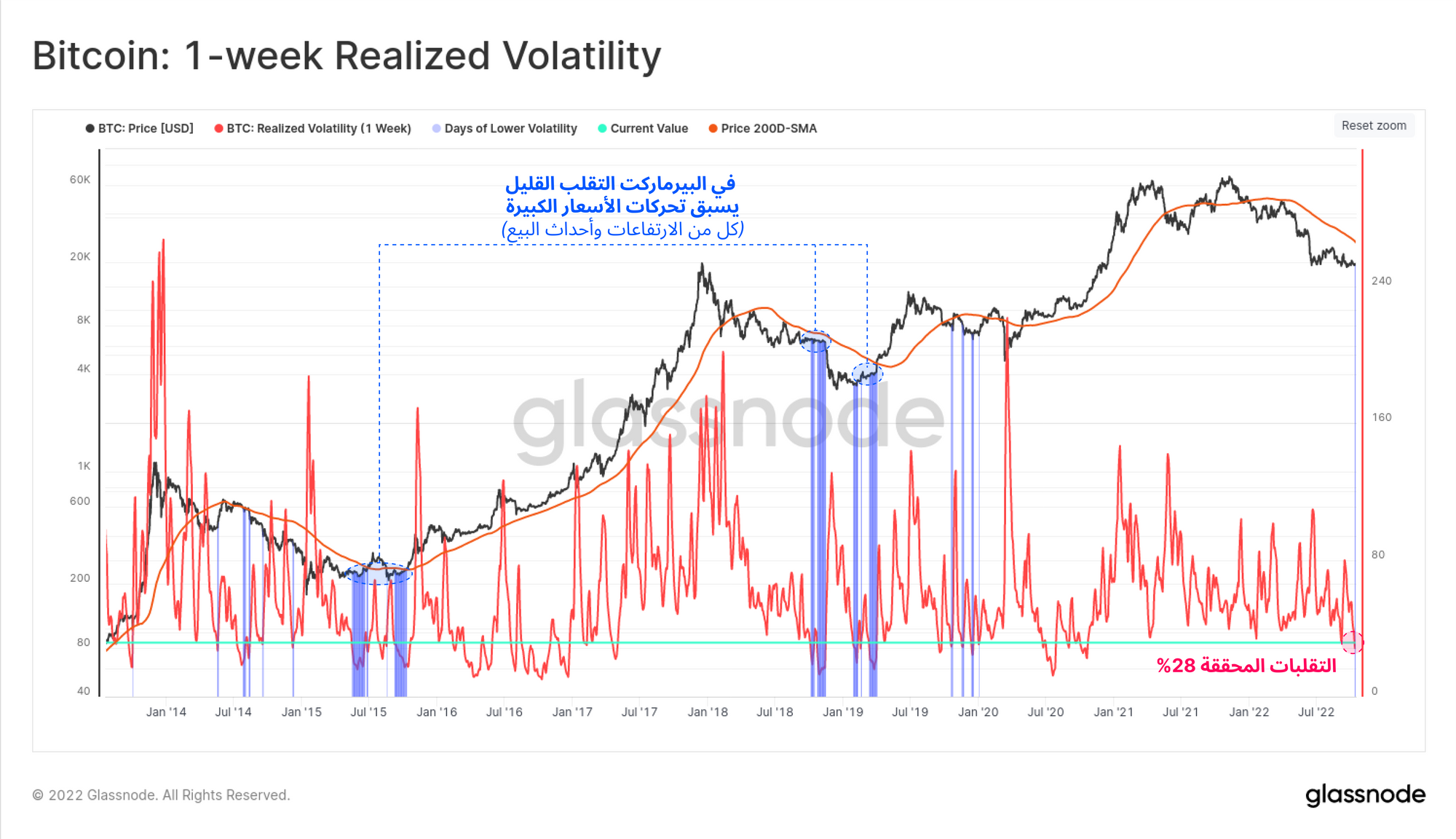 في إصدار هذا الأسبوع ، سوف نستكشف كيف أن سوق البيتكوين يمر حاليًا بفترة تذبذب منخفض تاريخيًا، ومع وجود العديد من المقاييس داخل وخارج الشبكة التي ترجح احتمال اقتراب فترة من التذبذب المرتفع. في فترات البير ماركت الماضية قام سعر البتكوين بالقفز بتذبذب عالي بالاتجاهين للصعود و النزول بشدة و بسرعة بدون اعطاء مجال كافي لقراءة الاتجاه.
