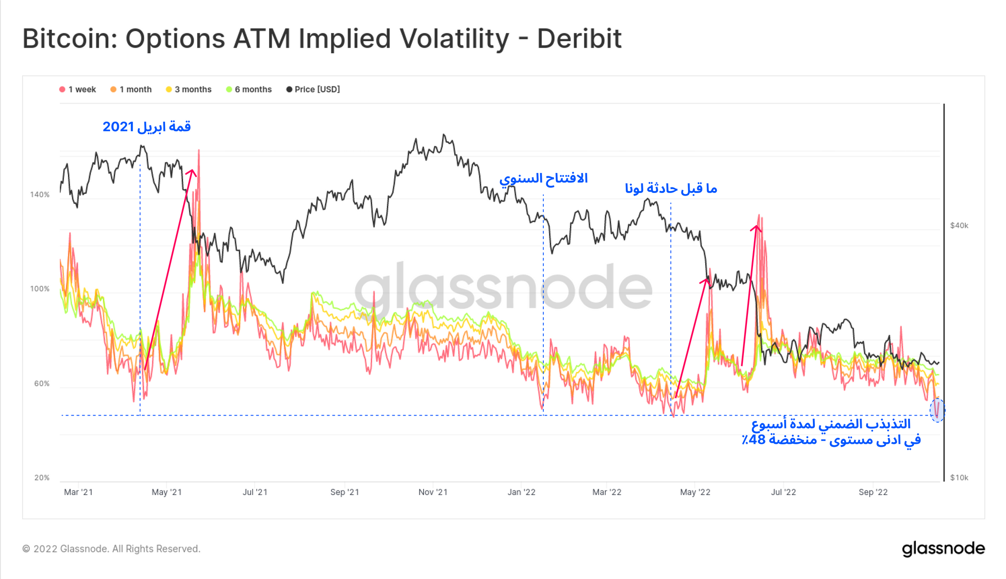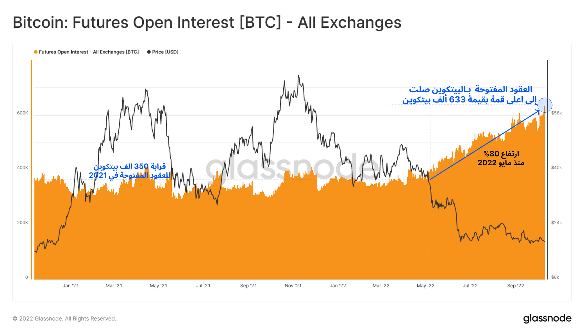 ولقد شهدنا أيضا زيادة قوية في معدل الفائدة ال Open Interset للعقود الآجلة ال Options منذ إنهيار الدولار الخوارزمي لمشروع لونا UST ووصلت الفائدة للعقود الآجلة للبتكوين لقمة جديدة وكانت بقدر 633 ألف بتكوين وذلك يمثل زيادة بنسبة 80% منذ شهر مايو لعام 2022 ونستنتج من ذلك إلي أن مستويات المضاربة وازدياد مراكز التحوط على الرغم من نزول الأسعار في السوق بشكل عام.
