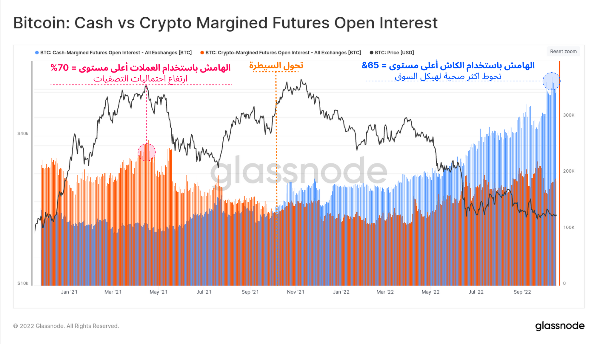 هناك مؤشر آخر يمكننا إستخدامه لقيم وضع سوف العقود الآجلة لتقييم صحة السوق وهو مؤشر نسبة المراكز التي تستخدم الكريبتو أو الكاش في العقود الآجلة :