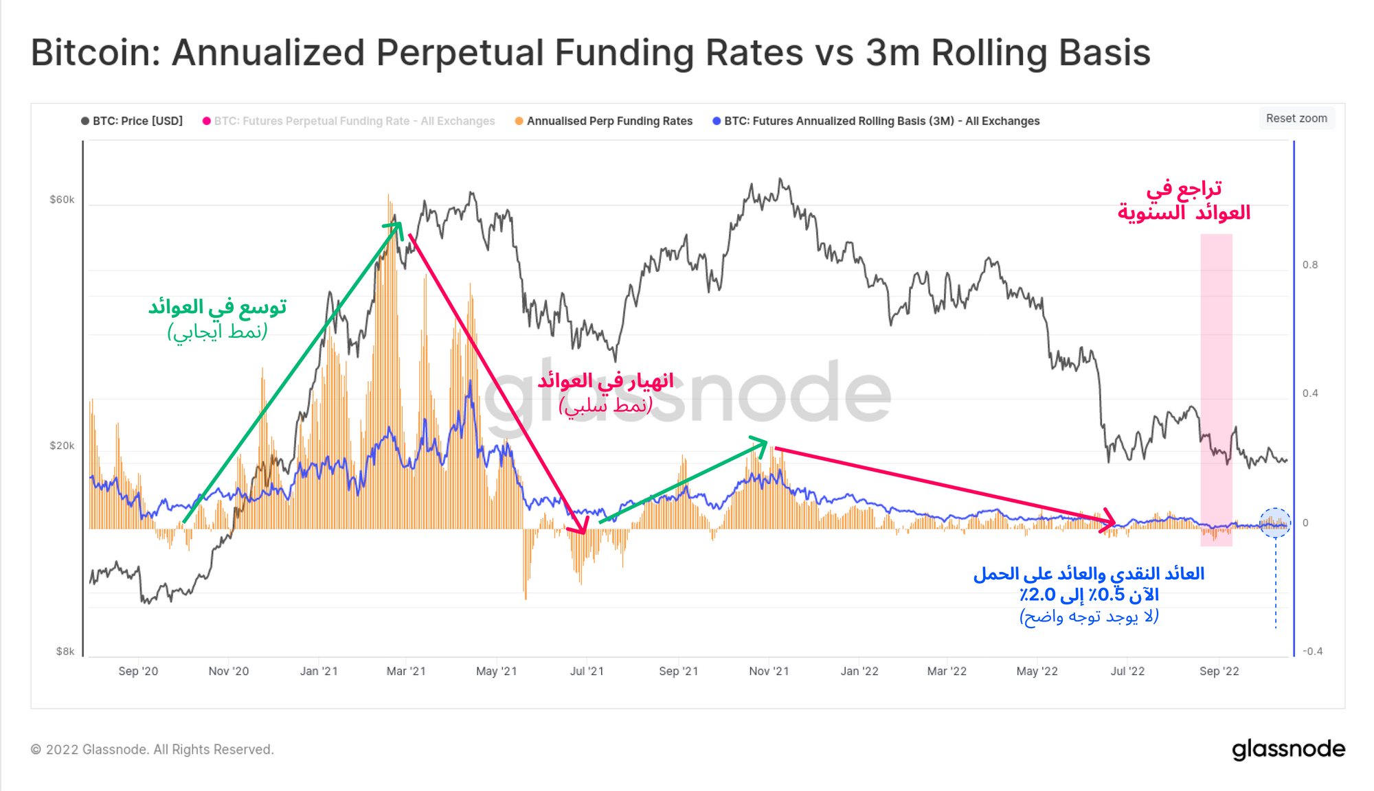 وقد انخفض هذا بشكل كبير منذ عمليات البيع الكبيرة المكشوفة من بعد مايو 2021 ، حيث يتم تداول كل من أسعار الفائدة المتجددة لمدة 3 أشهر (0.55٪ للسنة) ومعدلات التمويل في العقود الآجلة الدائمة (1.97٪ للسنة) الآن ، بعوائد ضئيلة مقارنة بما قبل مايو 2021 ، خاصةً بالنسبة للمعدلات السائدة لـ العديد من السندات السيادية. كما دخلت معدلات التمويل السنوية والأساس المتجدد السنوي لفترة وجيزة بالتراجع في أواخر أغسطس.