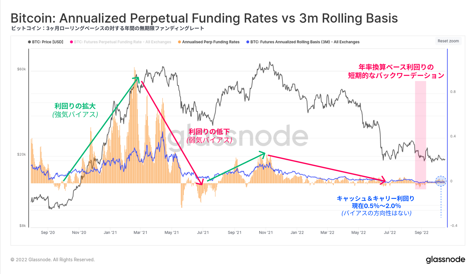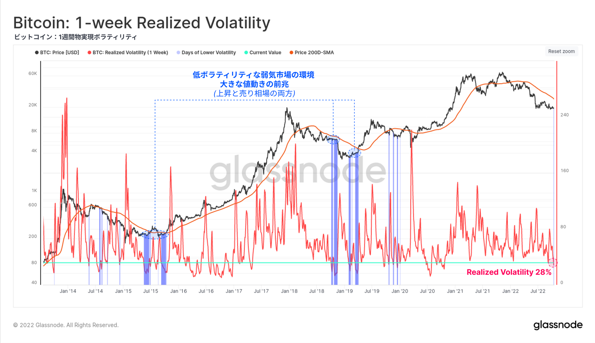 今週は、ビットコイン市場が歴史的な低ボラティリティ期にあるものの、オンチェーン、オフチェーンの両方における多くの指標がボラティリティ上昇期の到来を示唆していることを紹介する。歴史的な弱気相場の前例では、このような市場構造からは両方向にブレイクアウトしており、先物市場のプライシングでは方向性のバイアスはほとんど見られない。