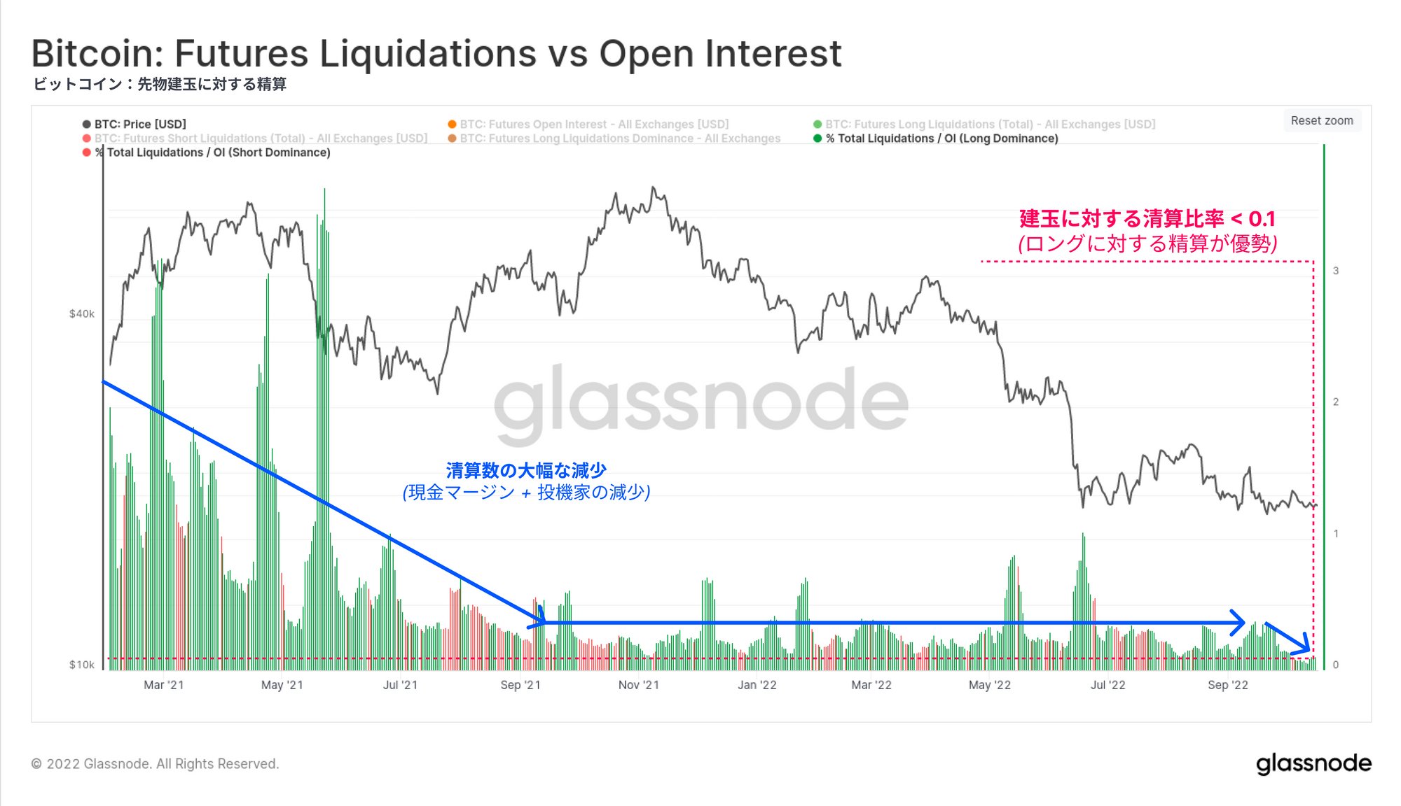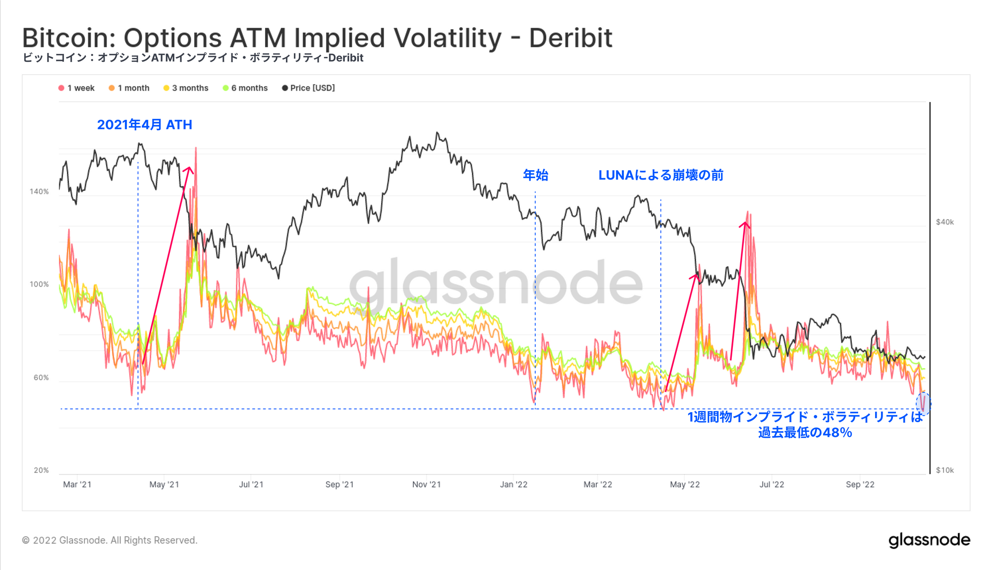 ビットコイン市場は、実現価格とオプションの予想変動率のいずれもが歴史的な低水準まで低下しており、ボラティリティが高まる前段階にある。先物の建玉は、精算が過去最低であるにもかかわらず、過去最高数を記録している。ボラティリティが回復する可能性が高いが、ビットコイン価格は依然として調整している。