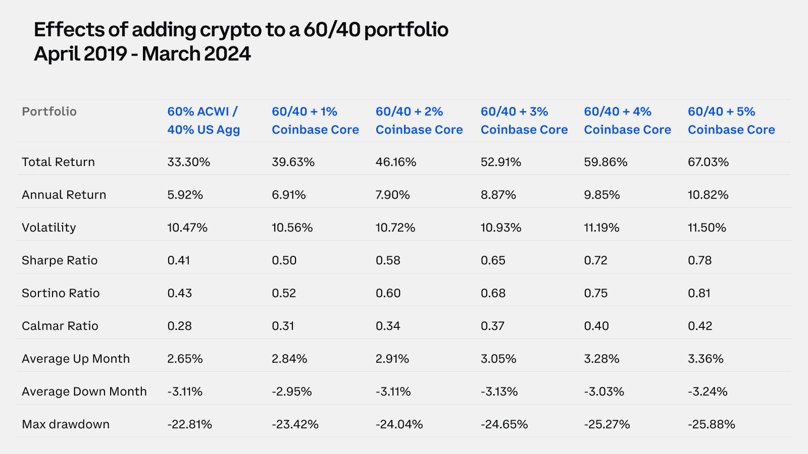 Between April 2019 and March 2024, incorporating a small allocation of crypto into a traditional 60/40 portfolio significantly enhanced risk-adjusted returns, with a 3% crypto allocation yielding 52.9% returns and a 5% allocation boosting returns to 67.0%, compared to 33.3% returns from the traditional strategy alone.