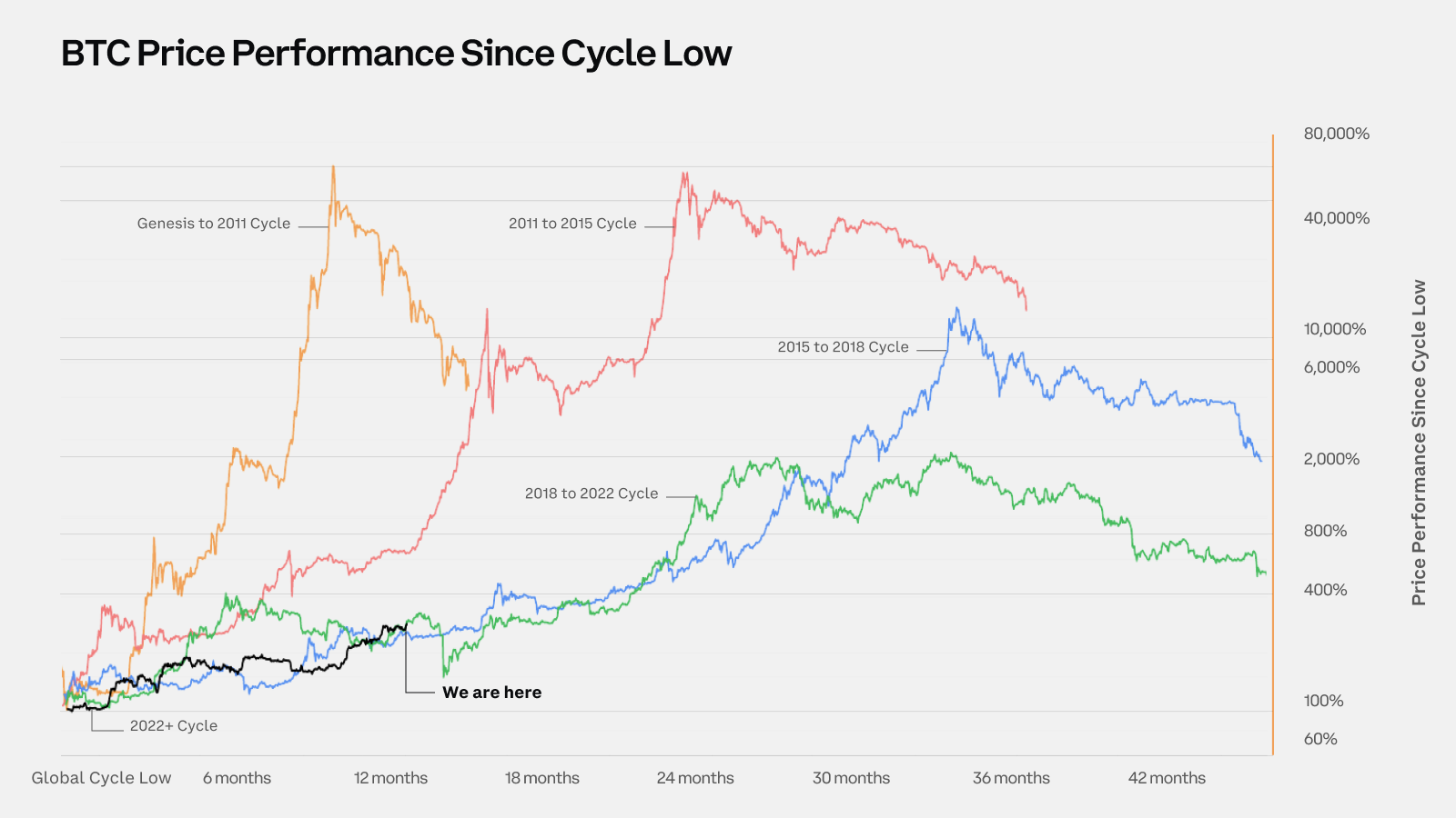 The digital asset market is driven by a remarkable cyclicality, helping both trend and long-only investors manage their entry or exit points. The previous two bull markets lasted 3.5 years; we're currently 1.5 years into the current one. The past cycles witnessed price increases of 113x and 19x, respectively, whereas so far this cycle, prices have only just quadrupled.