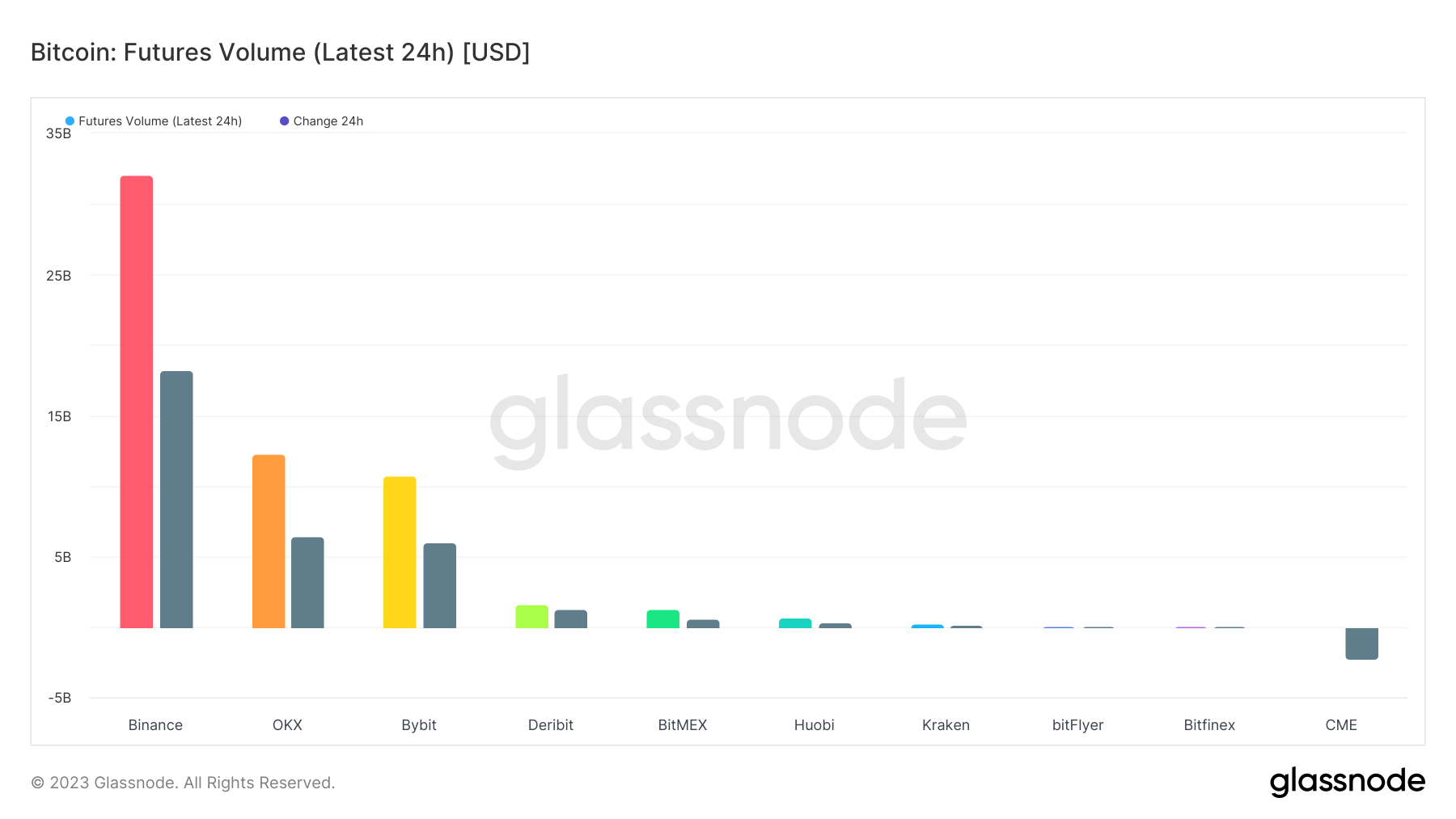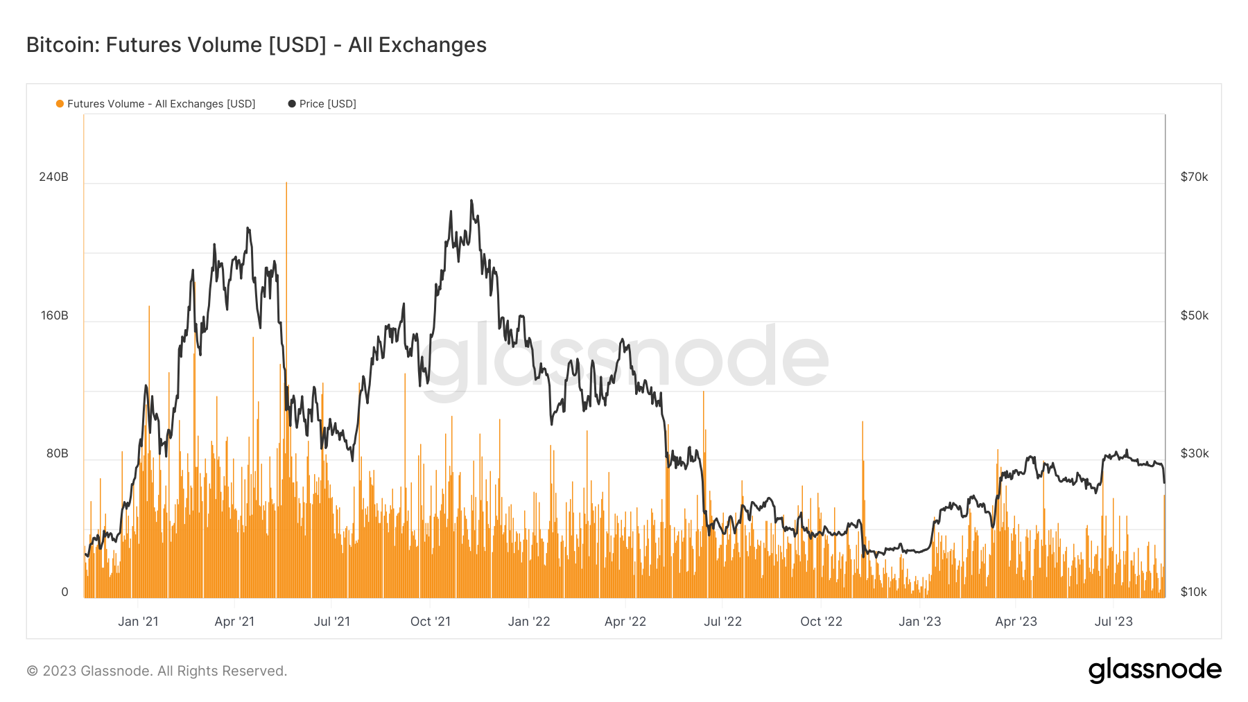 To better understand this surge in adoption, the Futures Volume metric below offers a snapshot of the market's evolution. The year 2023 has witnessed a 151% surge in Bitcoin futures trading volume for two key reasons: