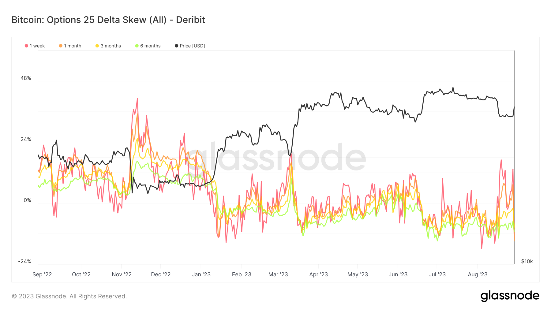 ATM Implied Volatility, as described earlier, serves as an indicator for anticipated market volatility. Historical data shows Bitcoin options markets usually trade at an implied volatility (IV) oscillating between 60% and even exceeding 100%. However, recent market movements tell a different story. The implied volatility plummeted to all-time lows by August 14th, only to surge dramatically as the market downturn unfolded a few days later on August 17th. This sharp repricing is significant, particularly in short-dated contracts set to expire by the end of September.