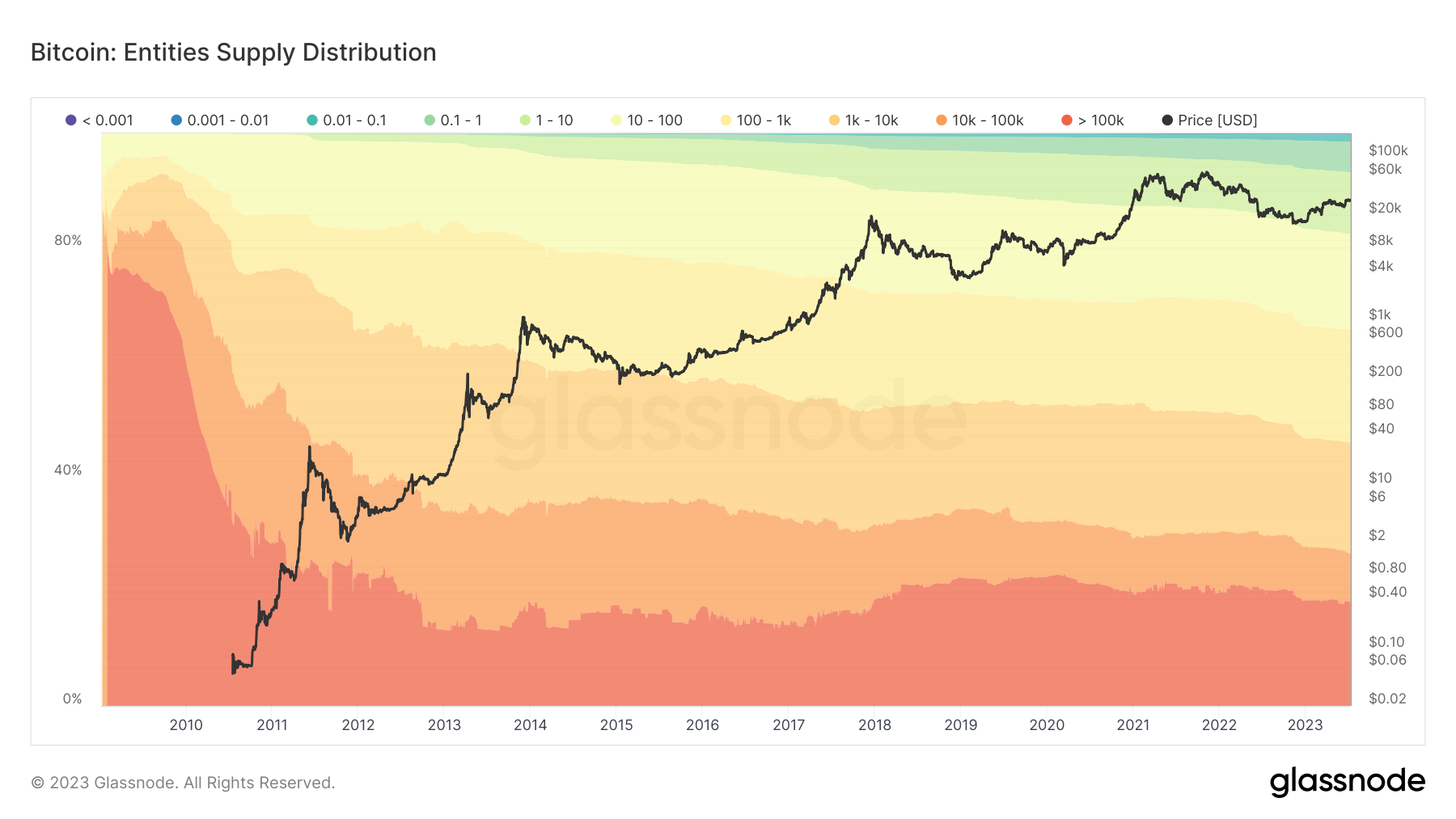 Monitoring the behaviour of Bitcoin whales is paramount. The 'Supply Per Whale' and 'Entities With Balance ≥ 1k' charts provide key insights into the behaviour of major holders, shedding light on their accumulation and distribution trends. Glassnode, with its comprehensive suite of tools - including charts, Workbench, and API - is at the forefront of these monitoring efforts. Its detailed on-chain data delivers necessary insights for analysts and financial institutions. As the crypto ecosystem evolves, on-chain data remains a crucial guide for advanced market comprehension