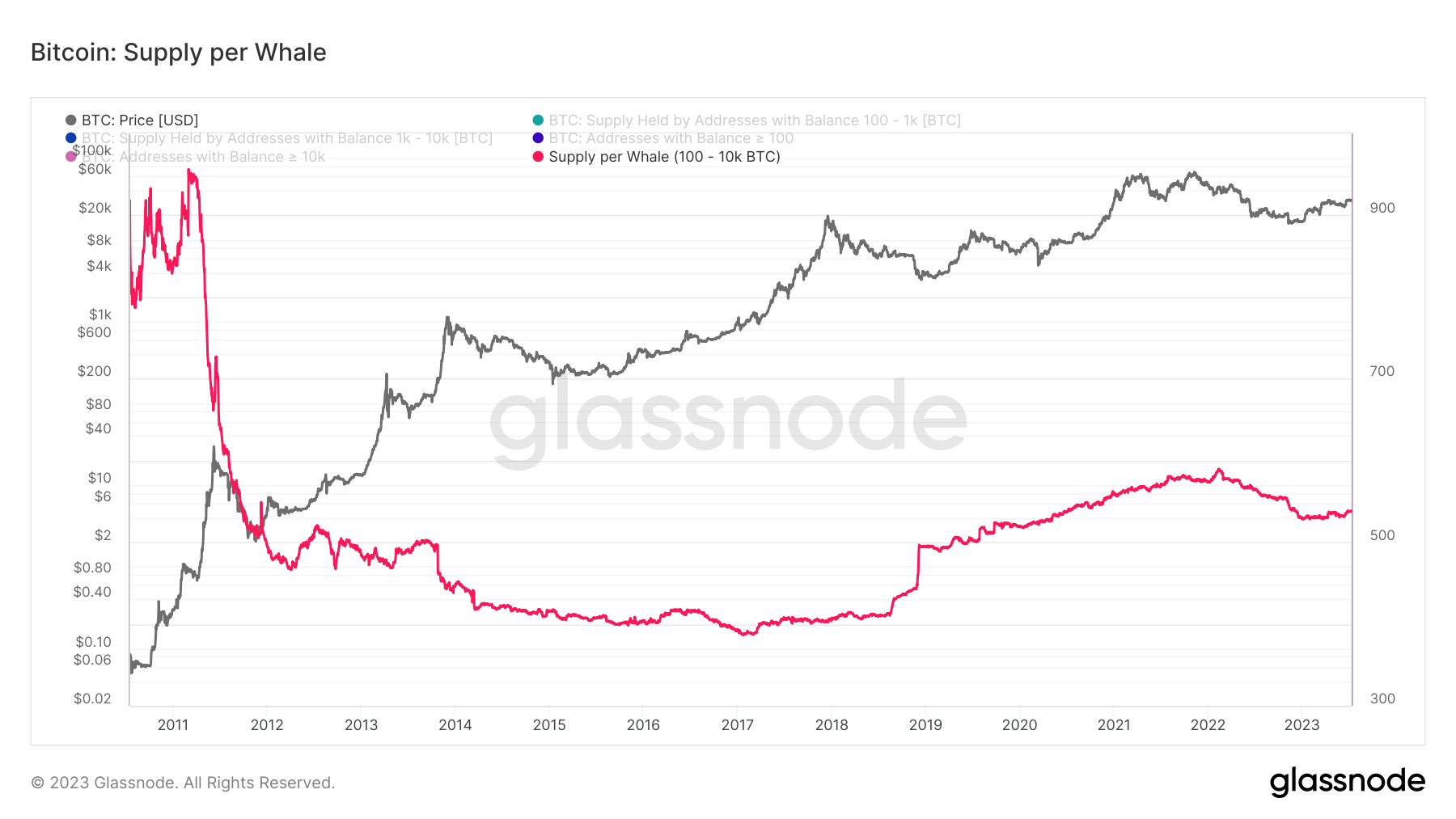 Building on the influx of institutional capital into the Bitcoin market in 2020/2021, the 'Supply Per Whale' metric becomes crucial in understanding these dynamics. It maps the distribution or consolidation of Bitcoin among addresses with 100 to 10k BTC. A rise in this metric signals Bitcoin whale accumulation, implying a reduced impact from institutional investors. Conversely, a fall indicates distribution, suggesting increased participation from these investors. This metric thus offers valuable insights into the evolving influences on the maturing Bitcoin market.