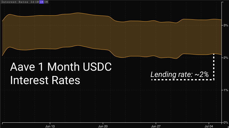 Rates have remained flat since May, settling at the 3% mark for borrowers. Yields contracting is generally a bearish signal; it shows a lower appetite for borrow and risk. If DeFi continues its move upwards we may see a tick up in interest rates. For now, rates remain uninspired during this leverage-limited move.