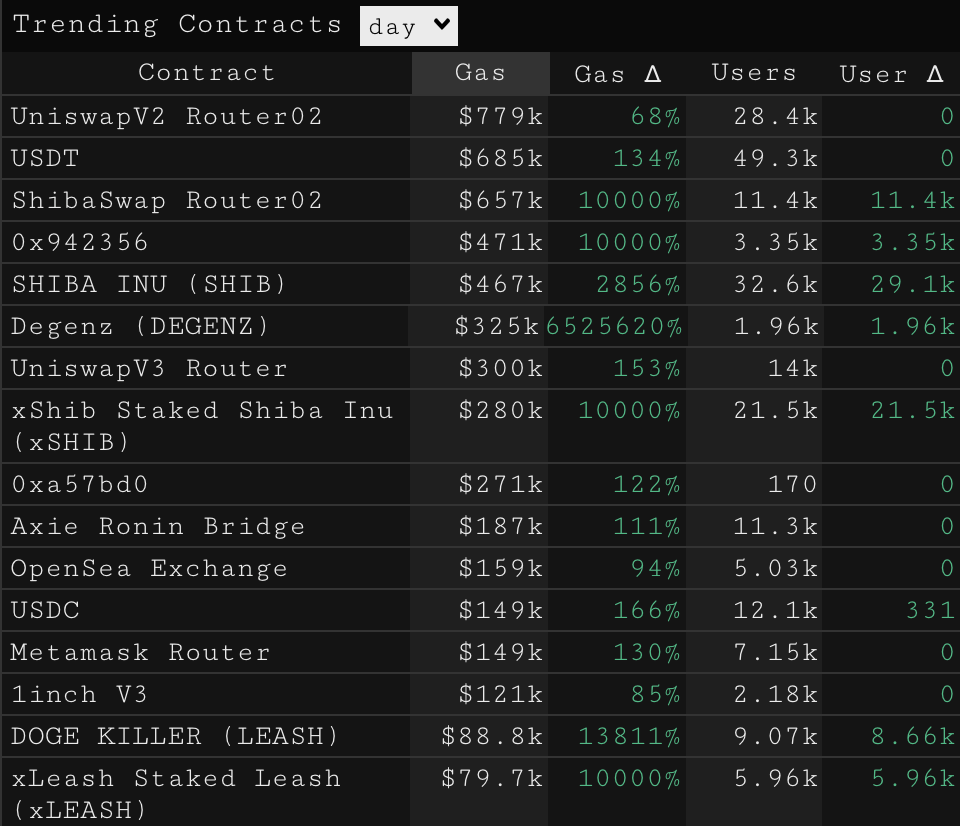 Note in the following table that 6 of the 16 highest gas guzzling contracts of the past few days were related to Shiba products.