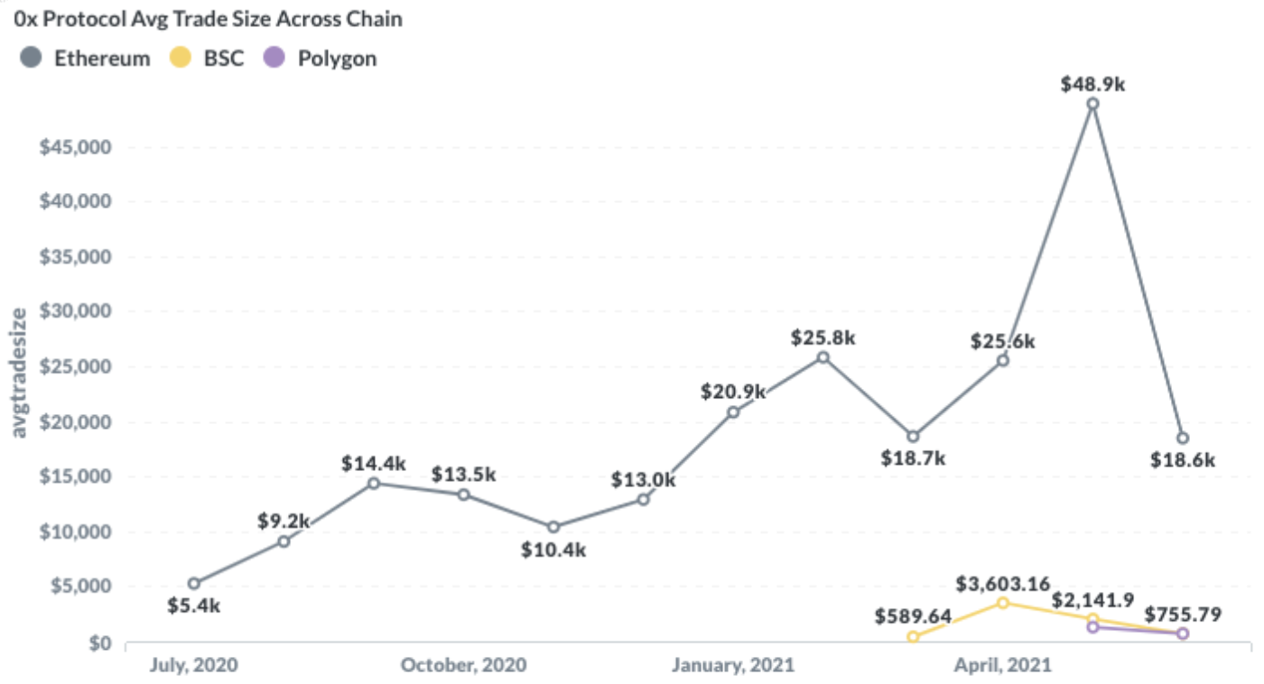 0x Labs noted an interesting piece of data on average transaction size. While in many cases Polygon transaction count can exceed that of Ethereum, the size of trades is dwarfed by Ethereum. The average trade size on Polygon currently sits at $755 while Ethereum sits at about $19,000 on 0x protocol.