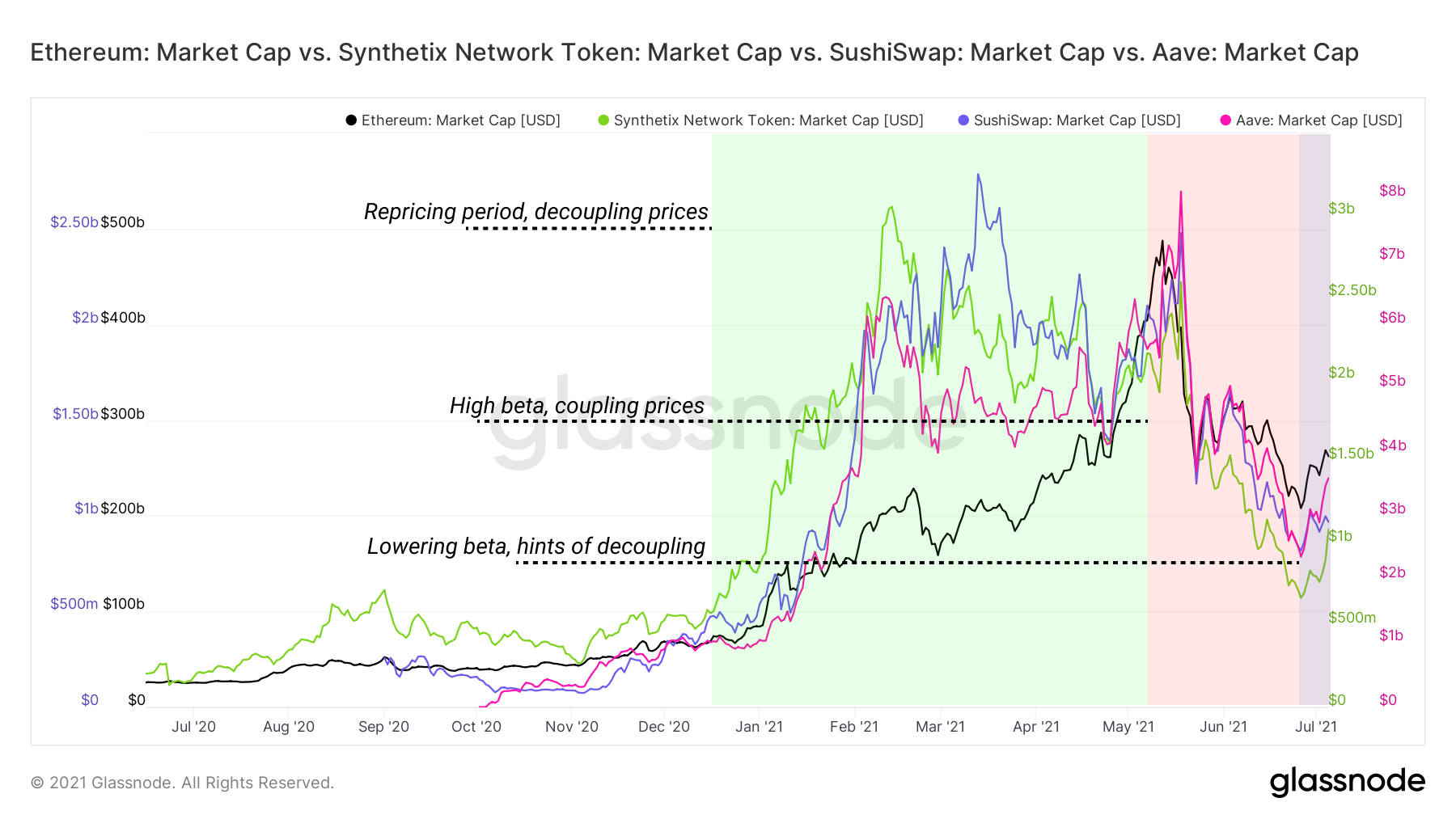 Into the price correction of May/June, we've seen prices recouple and experience high beta to ETH. In the past 7 days we've seen hints of DeFi reclaiming ground, somewhat decoupling from beta, however one week remains too short a time-frame to be conclusive on whether this is a new trend.