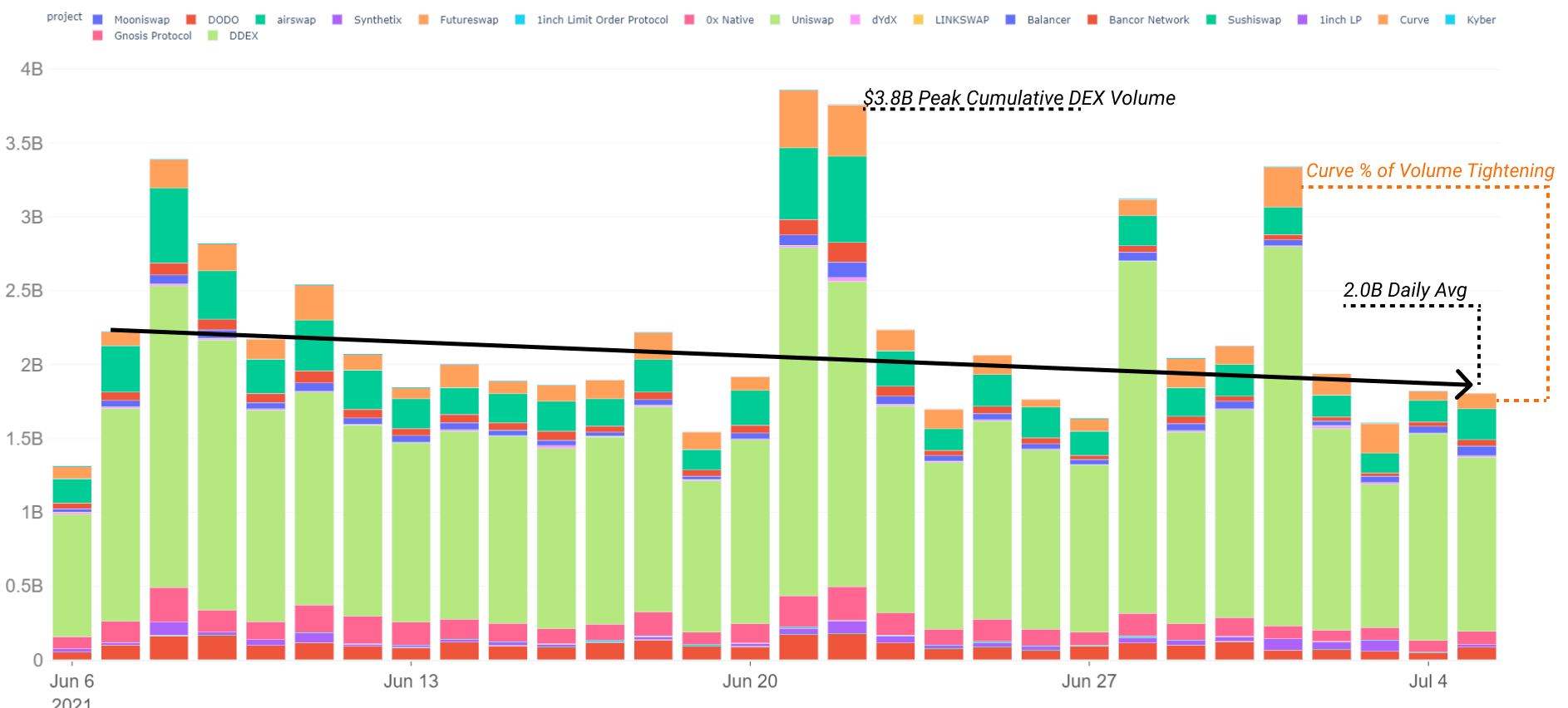 DEX volume remains flat through June, with many major metrics remaining unchanged since we covered the crash back in May. While the flat volume remains relatively insignificant, activity on Curve (in orange) has slowed considerably last month, marking a period where many stablecoin swaps are being settled elsewhere.