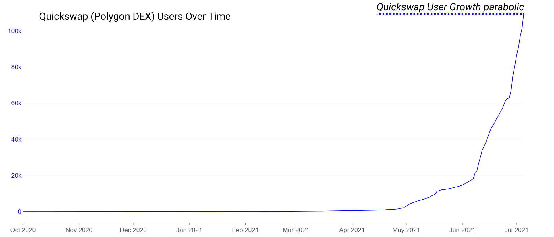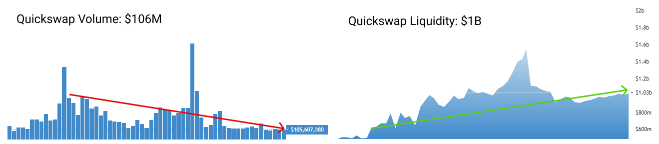 The most active DEX on Polygon is Quickswap, continuing to grow users at a parabolic rate. But are users translating to liquidity and volume?