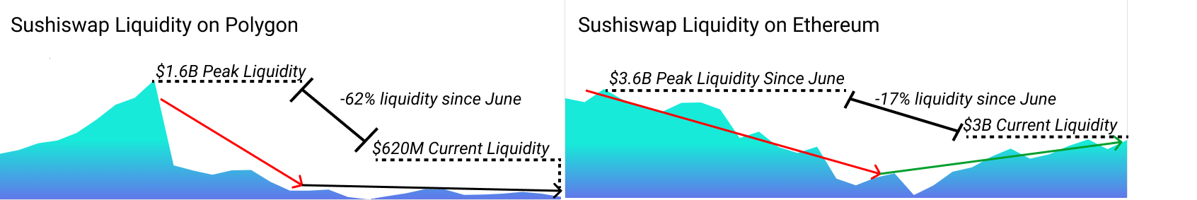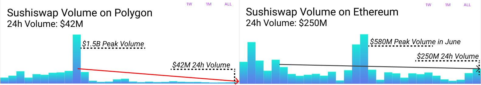 Many projects have been going multi-chain, bringing their projects over to Polygon and elsewhere to expand reach. It's interesting to compare the relative growth achieved by participating projects on each chain. Sushiswap, for example, saw strong growth on Polygon in its early days (June launch). This was during a period of extremely high liquidity mining incentives.