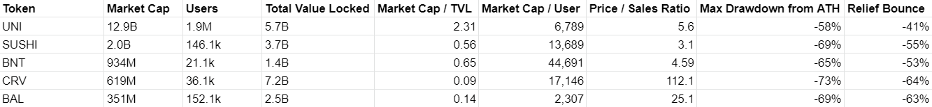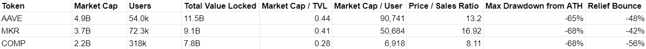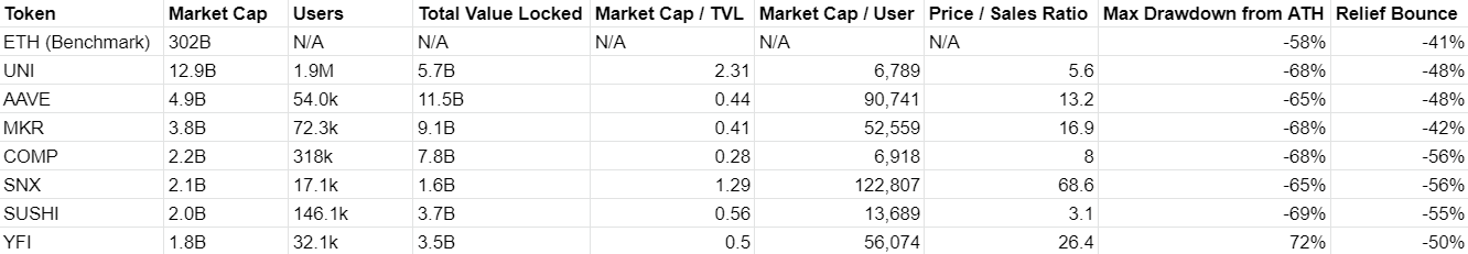We've seen TVL continue to act as a strong driver of price, with the two highest TVL protocols experiencing the softest drawdown from ATH. They also saw the strongest bounce off lows, alongside Uniswap and its dominant user base. Unsurprisingly, these TVLs are mostly correlated with market cap. The larger cap DeFi projects have led during the dip with stronger liquidity lessening the blow.