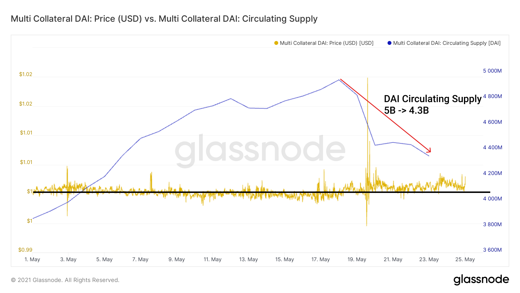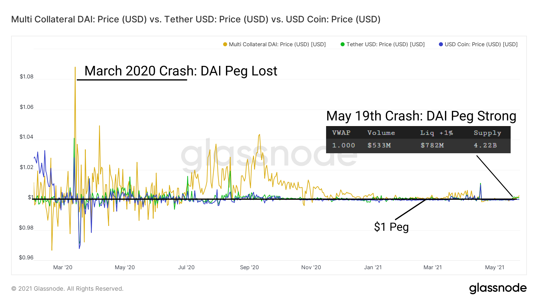 This was especially positive for DeFi because of the performance of DAI during the crash. DAI held its peg well, circulating supply adjusting accordingly in response to collateral requirements and protocol stability. As redemptions were claimed by collateral holders, collateral was reclaimed and DAI removed from supply. This behavior allows collateral to stay healthy, liquidations remain at a healthy level, and DAI maintain its peg.