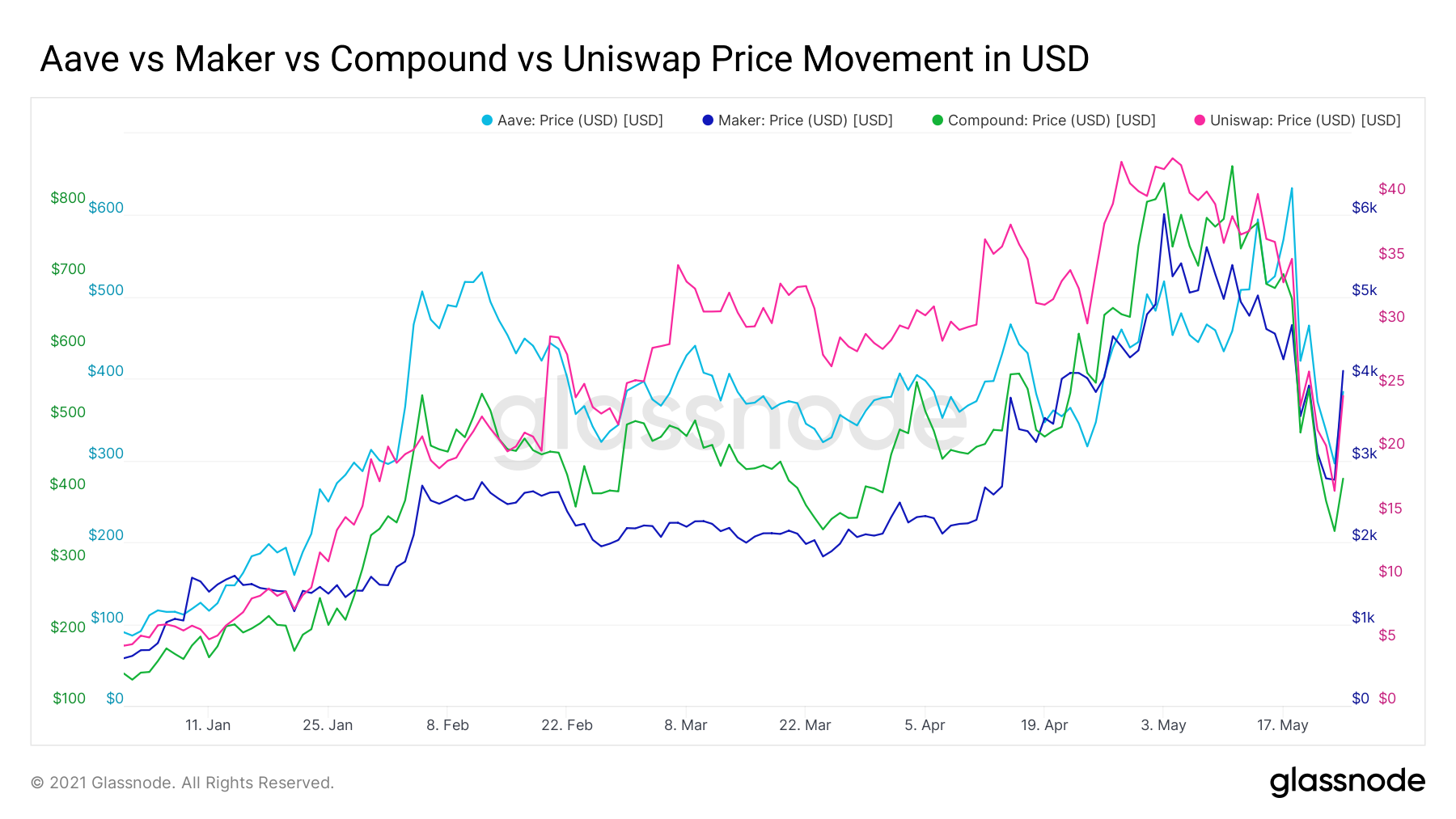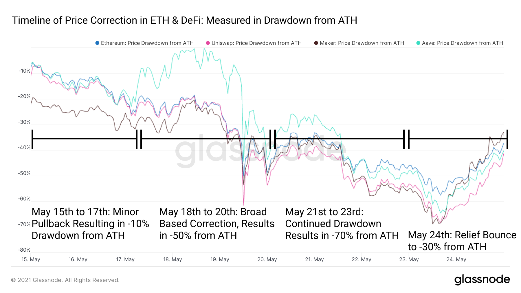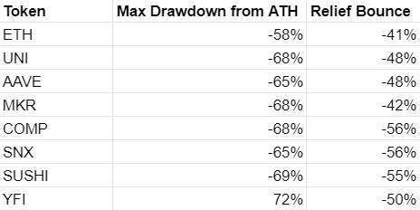 The reaction of DeFi to a broad based decline from ATH has been mixed. Token prices in blue chip DeFi have largely followed the decline of ETH, showing relatively high beta to ETH but not exceeding the decline from ATH by more than 15% from the decline of ETH among UNI, MKR, AAVE, COMP, SUSHI, and SNX.
