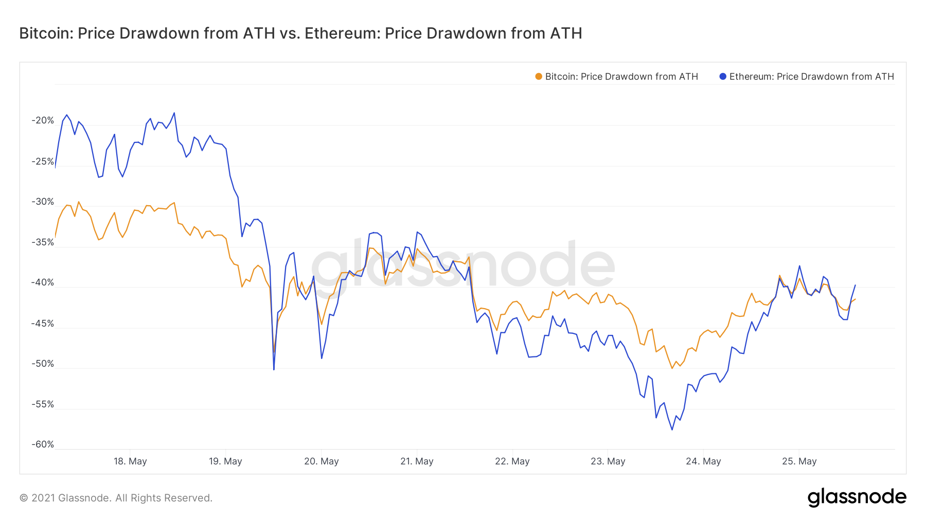 Zooming out, ETH/BTC showed resilience during the dip. In previous crashes risk has traditionally fled out of ETH to BTC, with ETH experiencing significantly larger drawdowns. This time around, the tune changed, with ETH remaining higher beta to BTC, but not by much. As ETH shows resilience to market declines over time vs BTC, it is possible DeFi participants flee to ETH as strength instead of BTC and stablecoins.