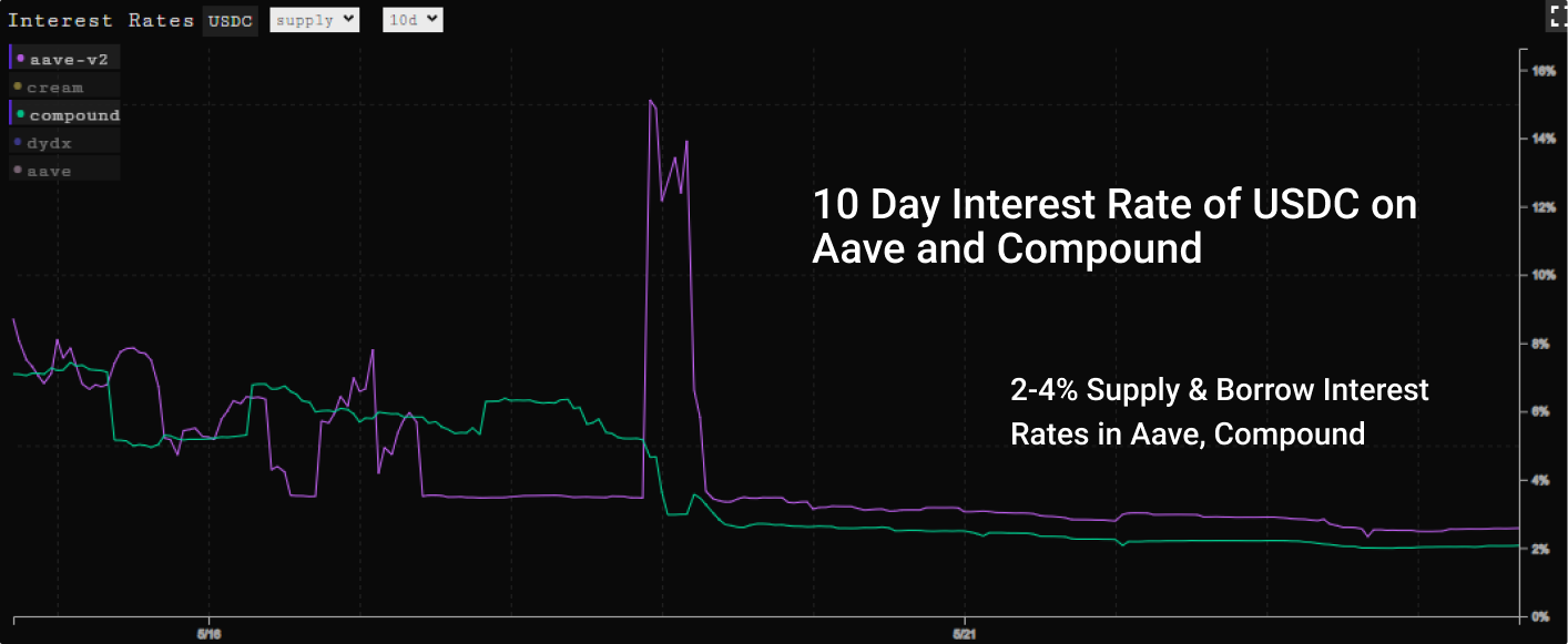 Rates stayed healthy throughout. As lend and borrow roughly stayed correlated the utilization rates stayed similarly healthy. The timeline for most lending markets played out as follows: