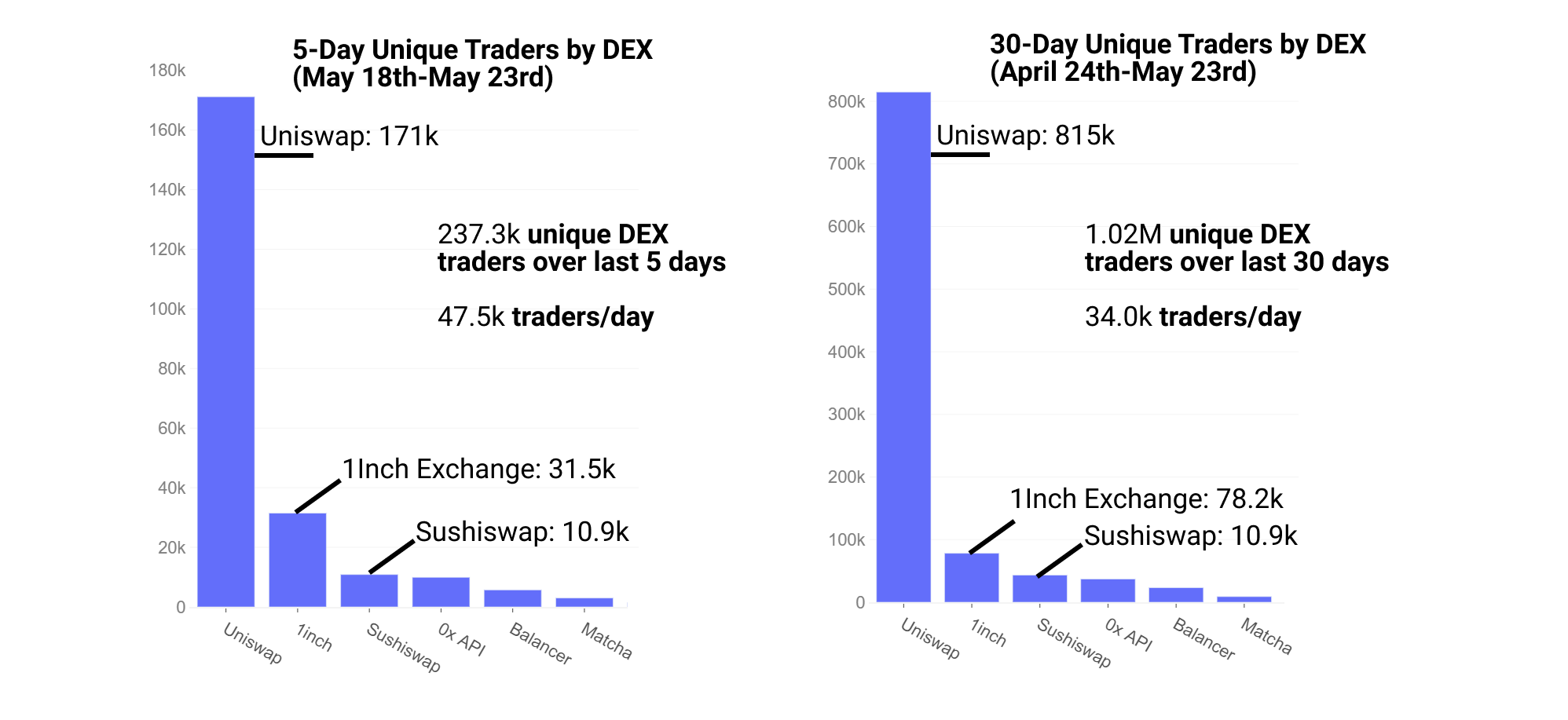 With heightened volatility, DEX volume rocketed to all-time highs. Record volume of $11.7B was set on May 19th amid selloff. Uniswap dominated with $5.7B in volume on $5.8B of liquidity, while Sushiswap was in a dominating second position at $2.8B on $3.5B of total liquidity.