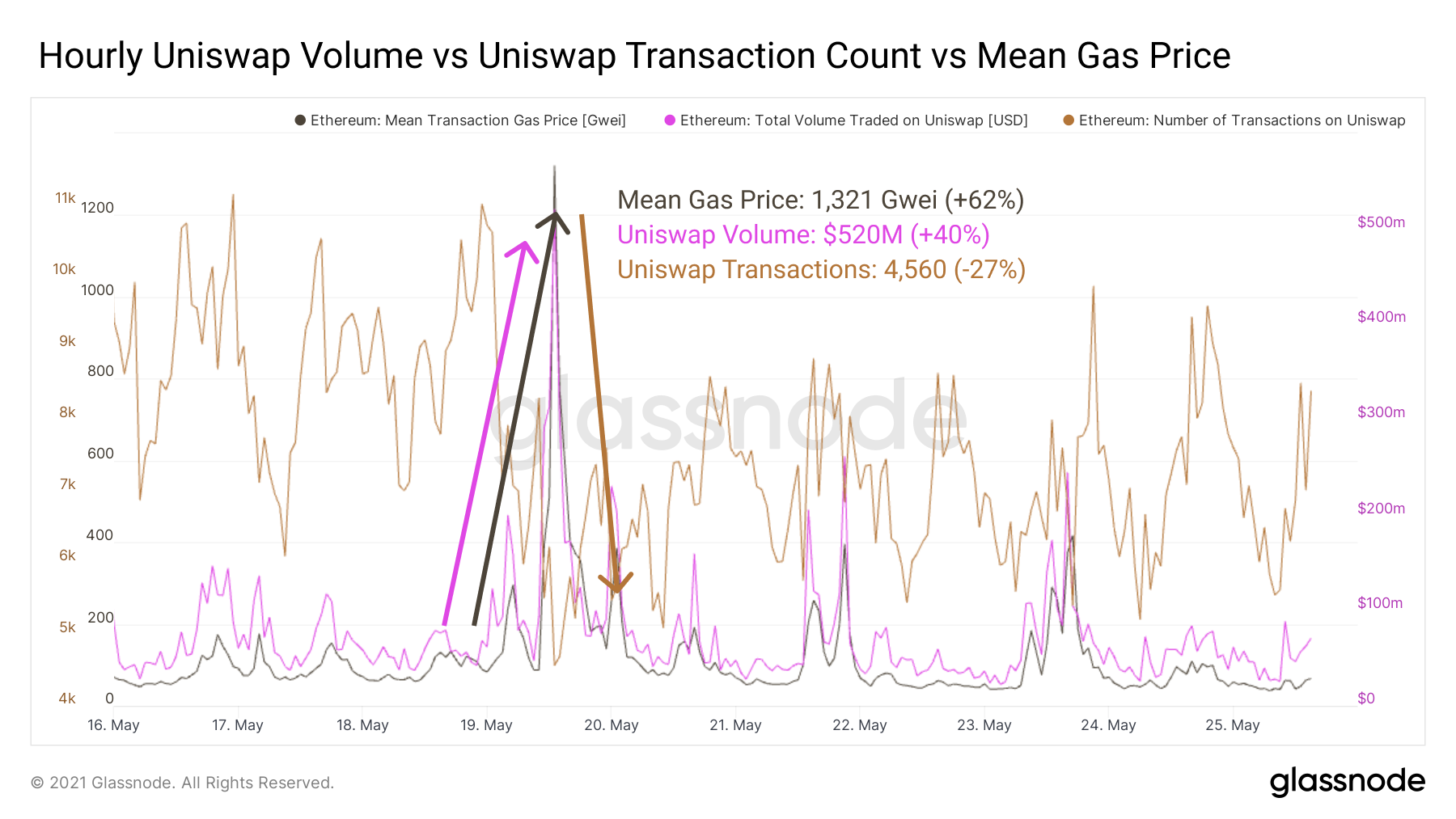 Interestingly, the pricing out of retail was seen through a steep drop in total number of trades but dramatic increase in total volume. Many were forced to sit on their hands, for better or for worse. If a trader wants to offload $3,000 in risk but gas prices are >$700/swap, it's unsurprising they choose against making the trade. For larger traders, $700/swap is relatively easy to stomach if the position sizes are 100x or greater the size of fees. As the crash ensued, volumes went way up as larger holders moved risk. Total transactions fell as smaller traders were priced out of taking any actions on-chain.