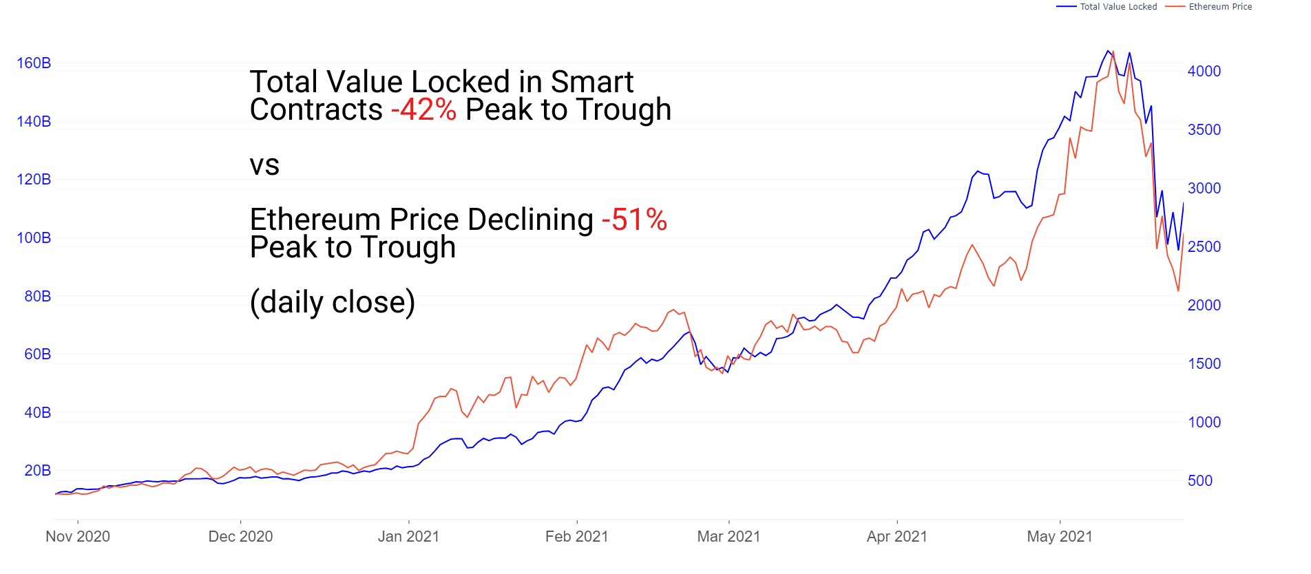 Total value locked in smart contracts has fallen 42% peak to trough, moving generally in line with the price of Ethereum, which fell 51% peak to trough.