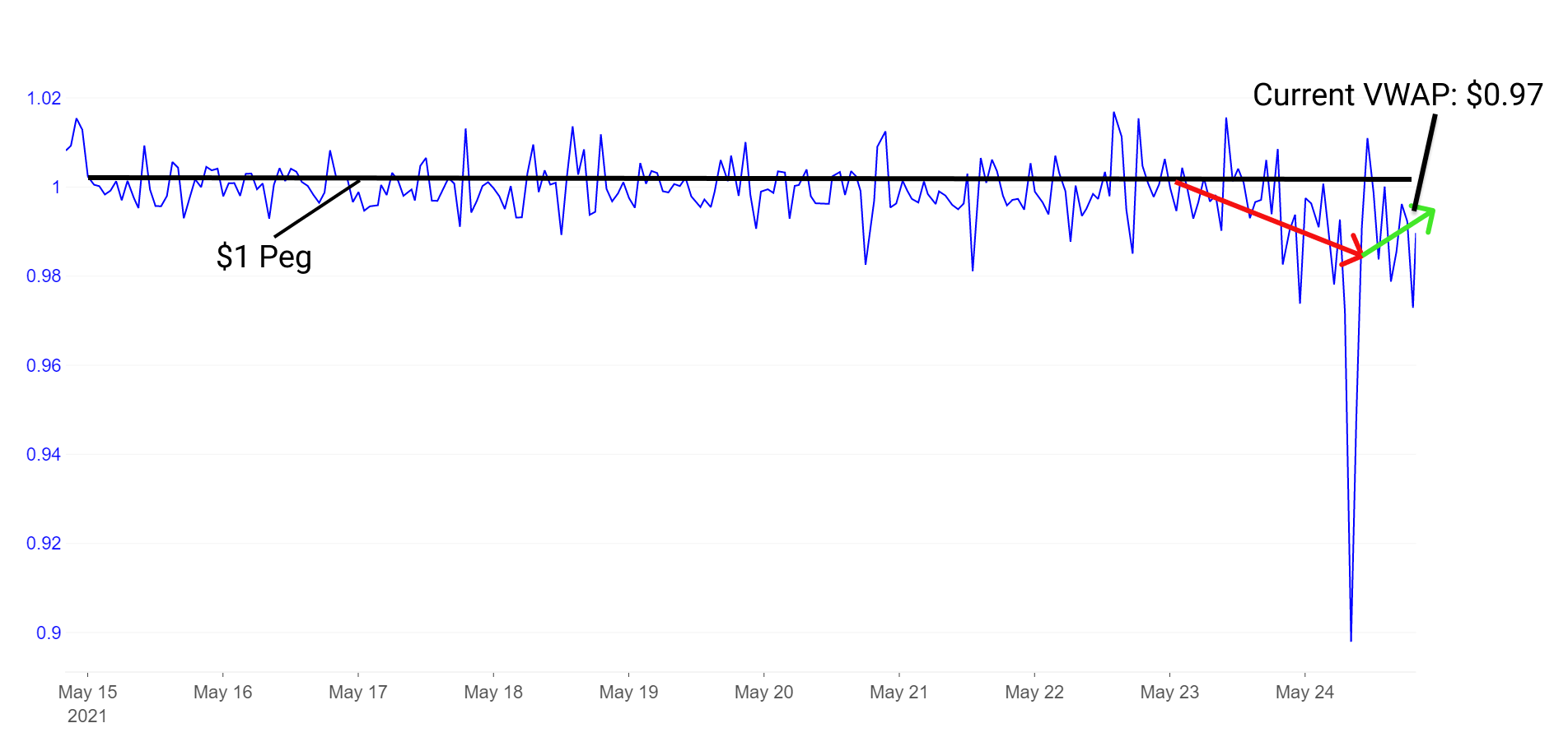 Unfortunately, one stable of relatively strong adoption (~2B circulating supply) failed to maintain its peg. TerraUSD (UST) lost its peg on the 18th as the value of its collateral from LUNA fell below that of the stablecoin it collateralizes. The LUNA/UST ecosystem currently suffers additional risk, partially due its market size. Whereas the DAI/MakerDAO ecosystem commands greater than $8B in ETH collateral for a $5B DAI supply, UST's $2B supply skated close and at times below its roughly $2B in LUNA collateral. Fortunately, loss of peg was not too severe for the duration of the crash.