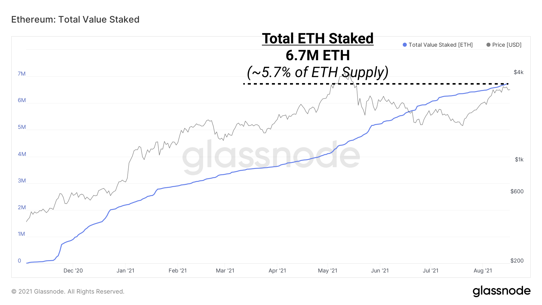 In terms of the total value currently staked in the ETH 2.0 contract, over 6.7M ETH has been deposited, representing 5.7% of the circulating supply. The trend of ETH being withdrawn from exchanges and deposited into yield bearing opportunities in the DeFi space remains a trend to pay attention to.