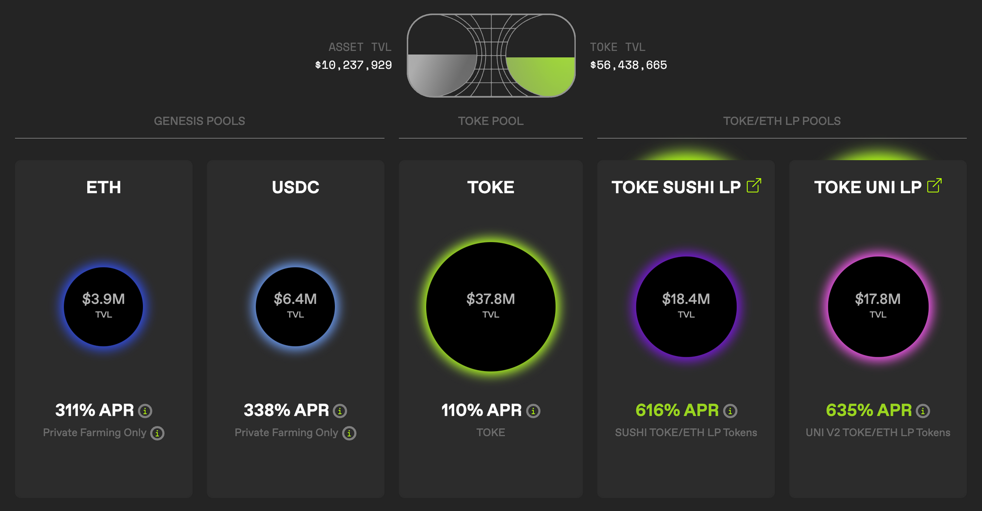 The protocol finished its so-called "DeGenesis" event, issuing its governance token TOKE to commitments in its initial offering. DeGenesis participants also get early access to the protocol during the private farming stage for the ETH/USDC pool.