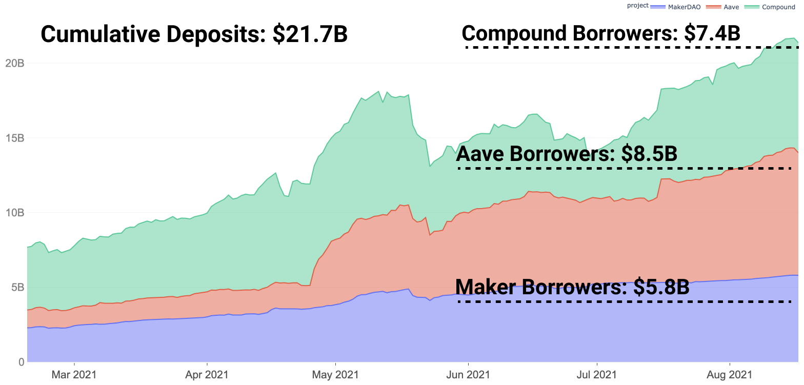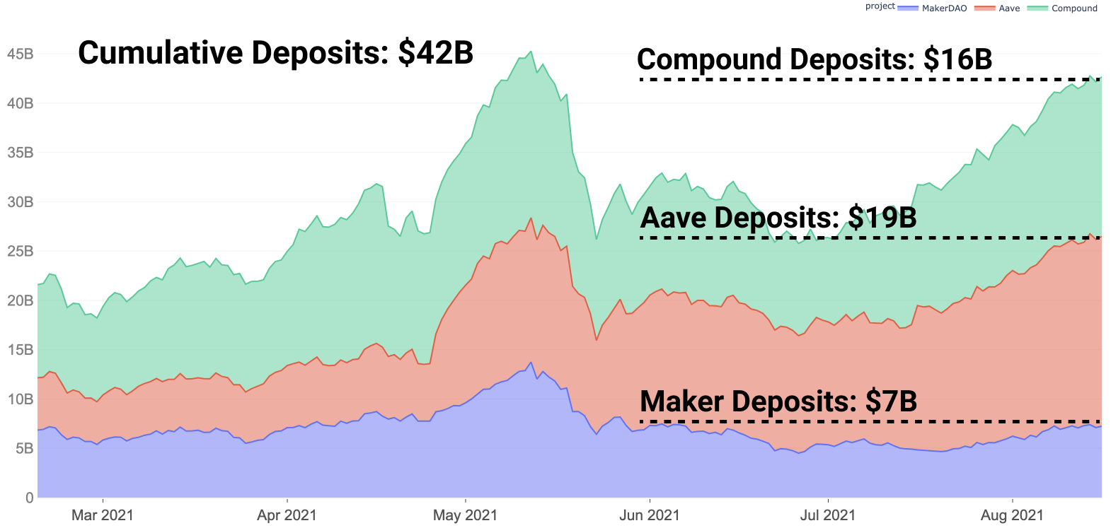 A number of DeFi metrics have ticked positive for the month of August. The first being the volume of deposits and borrow in lending protocols which have increased alongside positive price performance. Between the three market leaders Maker, Aave and Compound, a combined value of $42B is currently deposited as collateral.