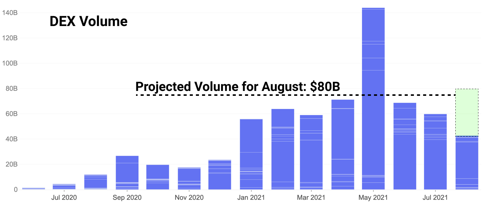 Meanwhile, DEX activity is looking healthier, with monthly estimates set to print a growth in volume relative to previous months. The total trade volume at the time of writing is $46B, and is on-track to reach approximately $80B for the month of August.