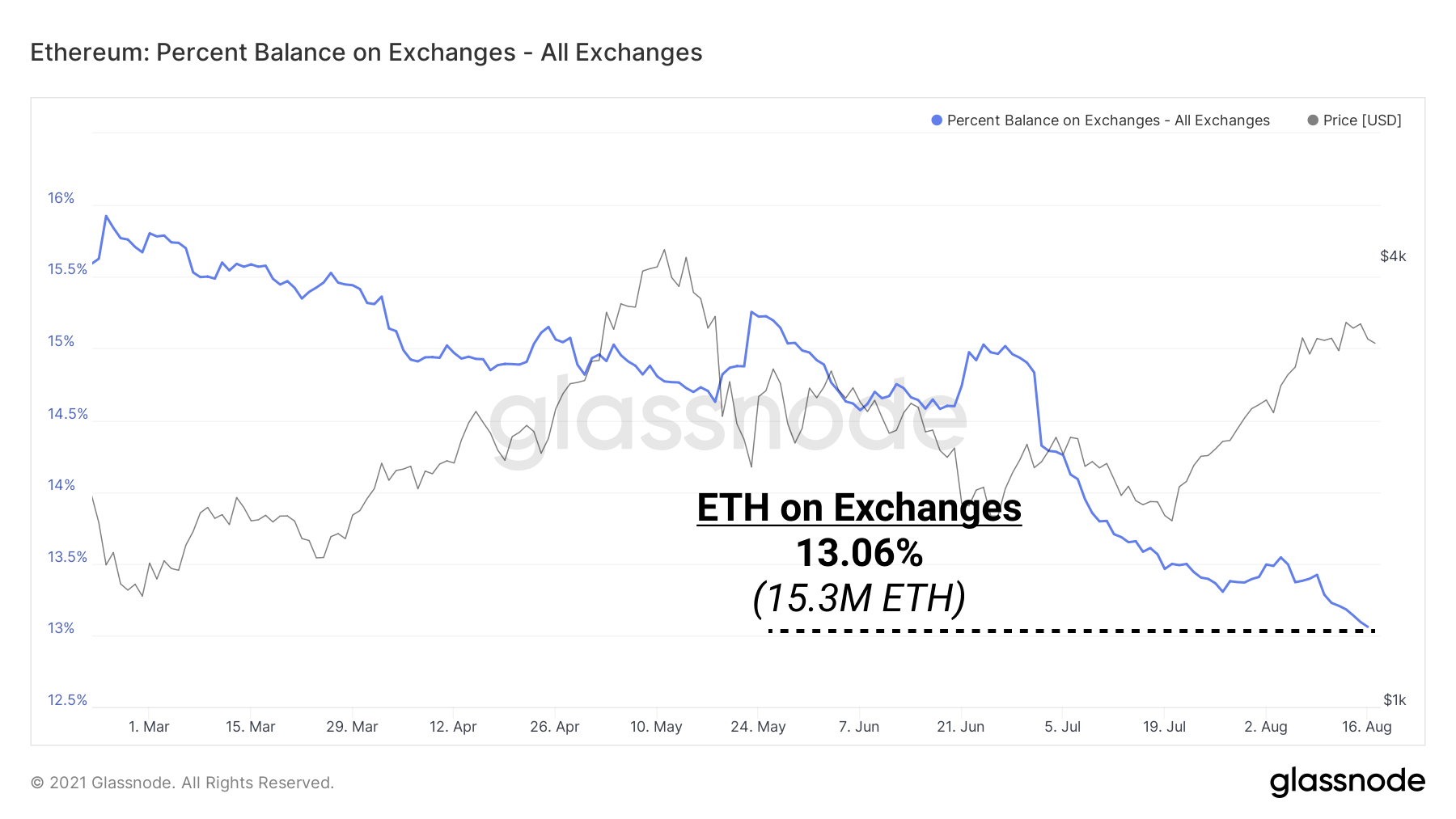 The recent tick up in ETH price has been supported by a continued outflow of ETH supply on exchanges. Exchange ETH balances have now declined to reach an all-time low of 13% of the circulating supply this week, equivalent to 15.3M ETH.