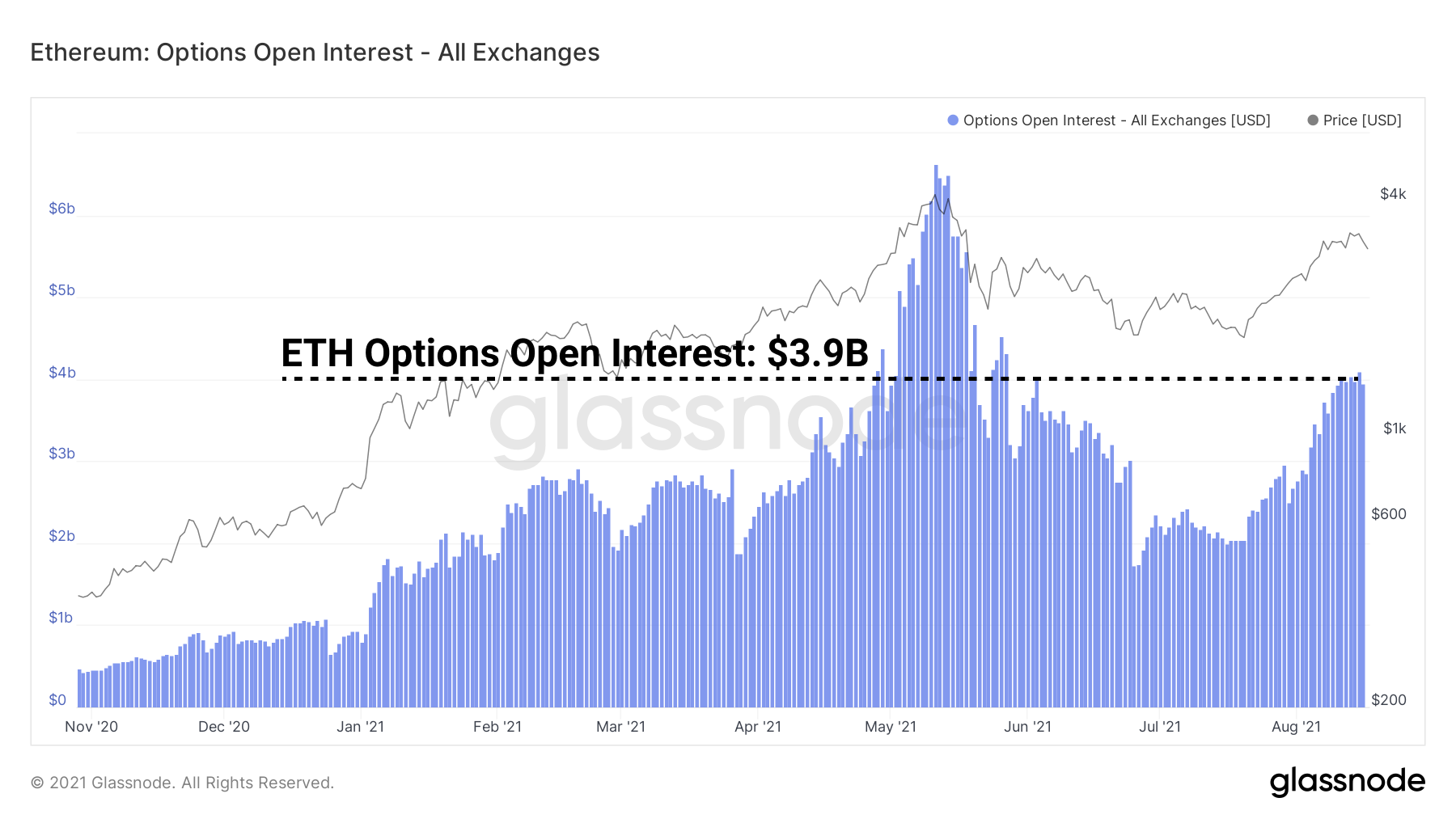 Interest in ETH options markets has also expanded over the last few weeks as traders deploy capital to express a directional view, or hedge existing positions. Open interest in options markets reached $3.9B this week, about 40% below the ATH set in May.